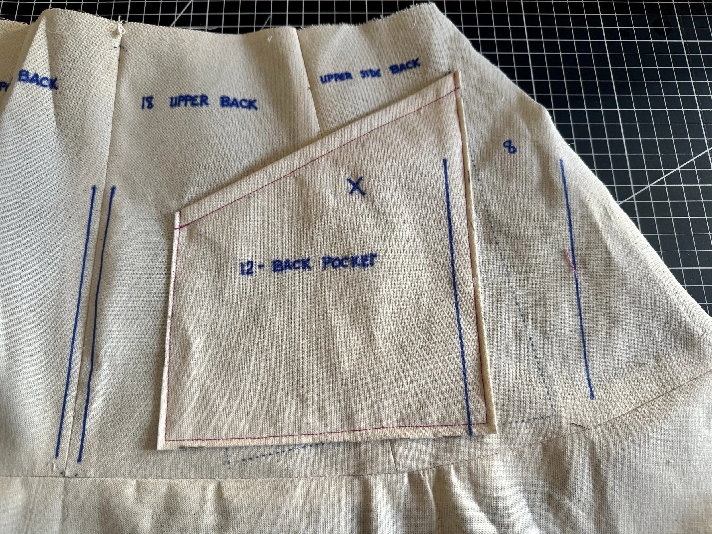 If adding pockets to the back, sew piece 12 - top stitching the upper edge before sewing the sides and bottom to the skirt panel. Line up the edges of the flap to the pocket before sewing down in the same manner as the front.