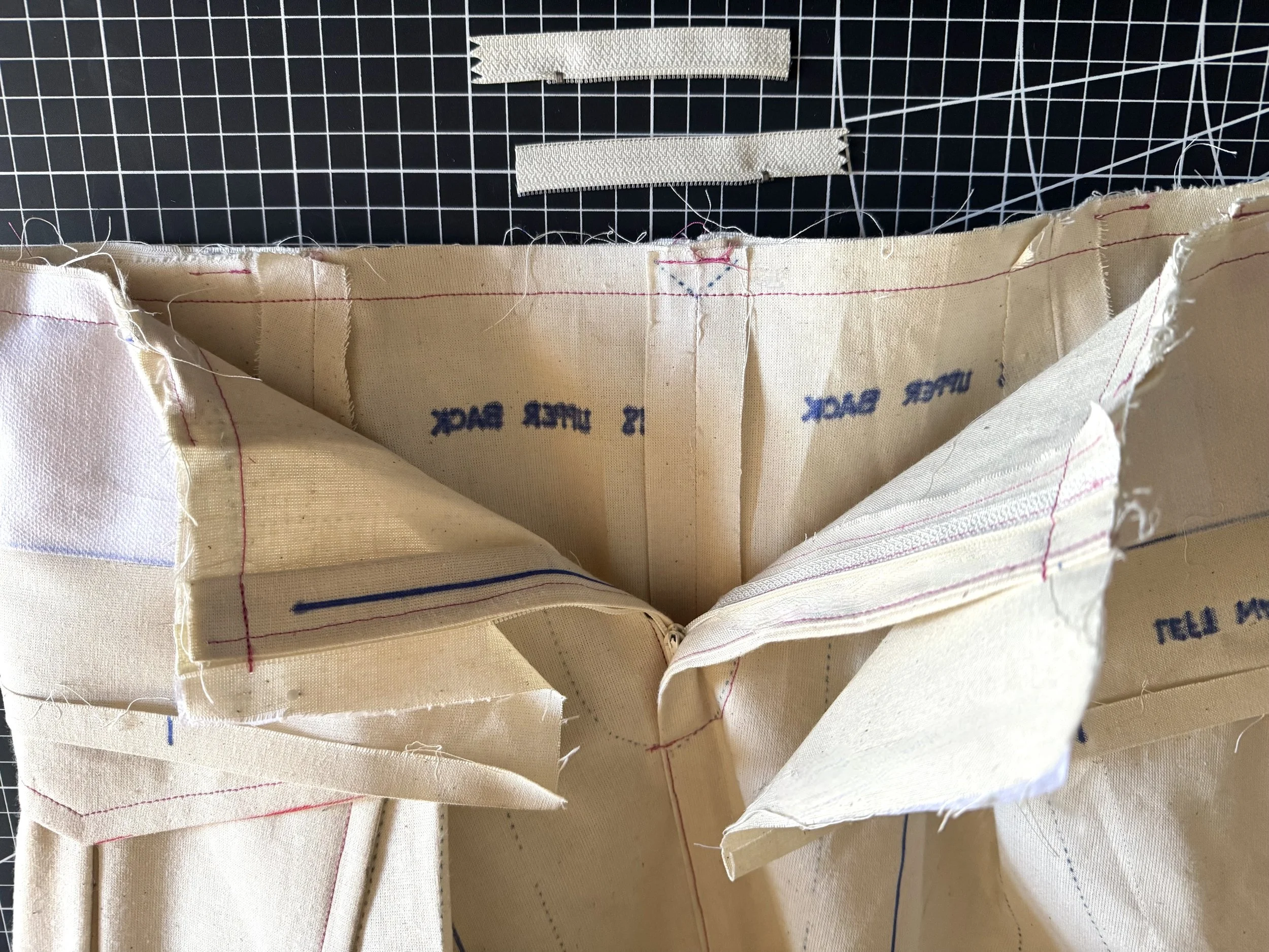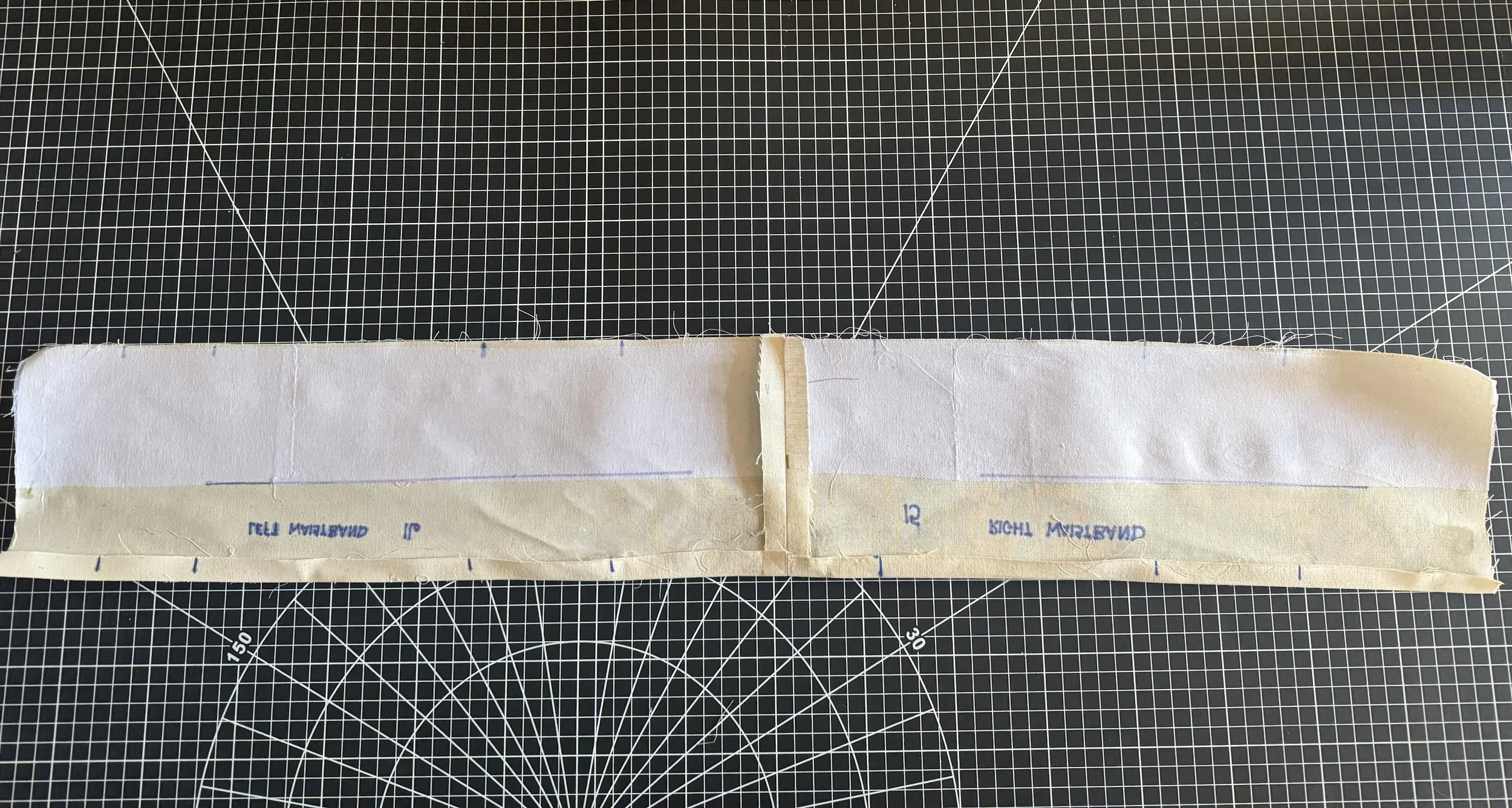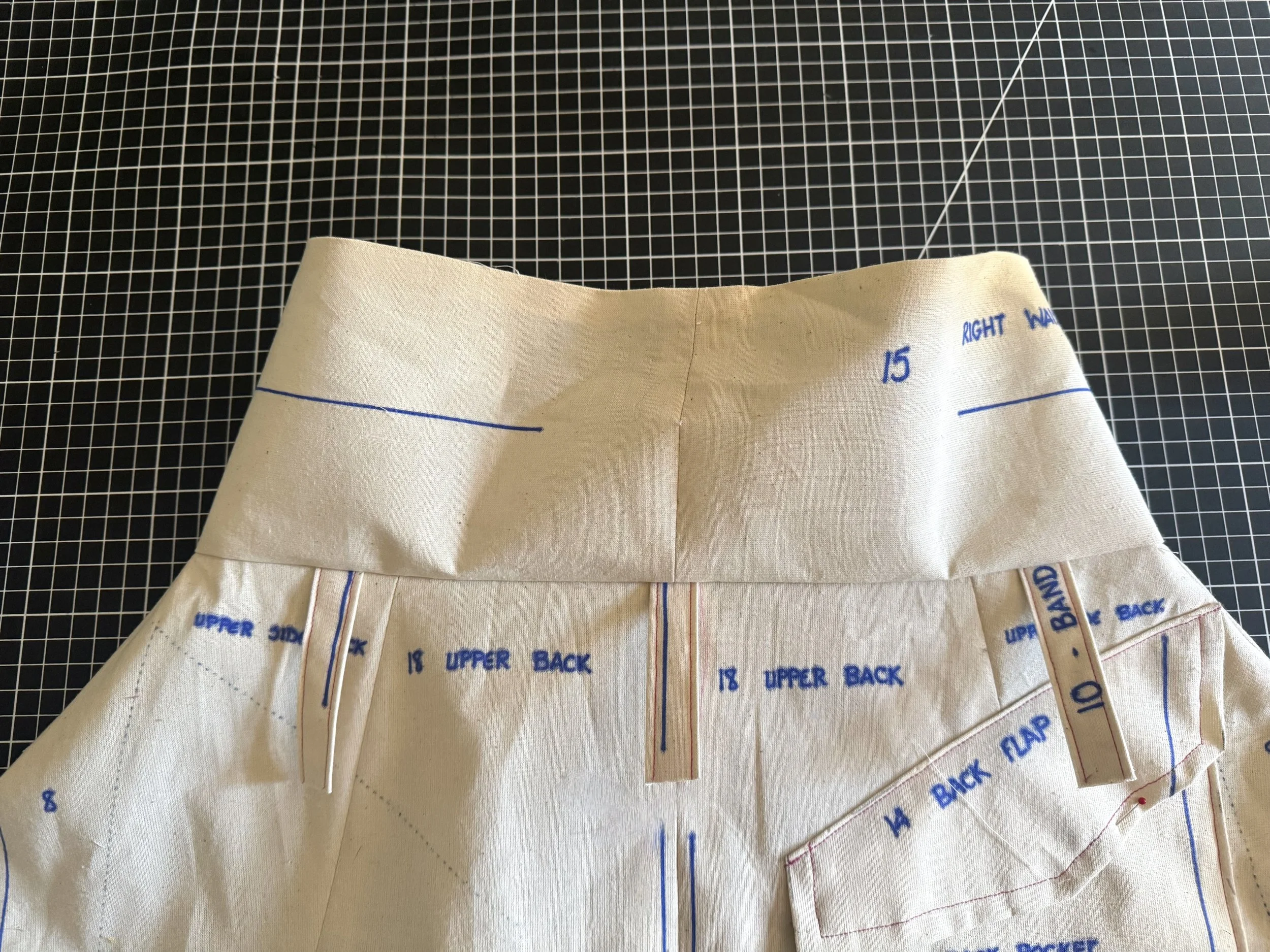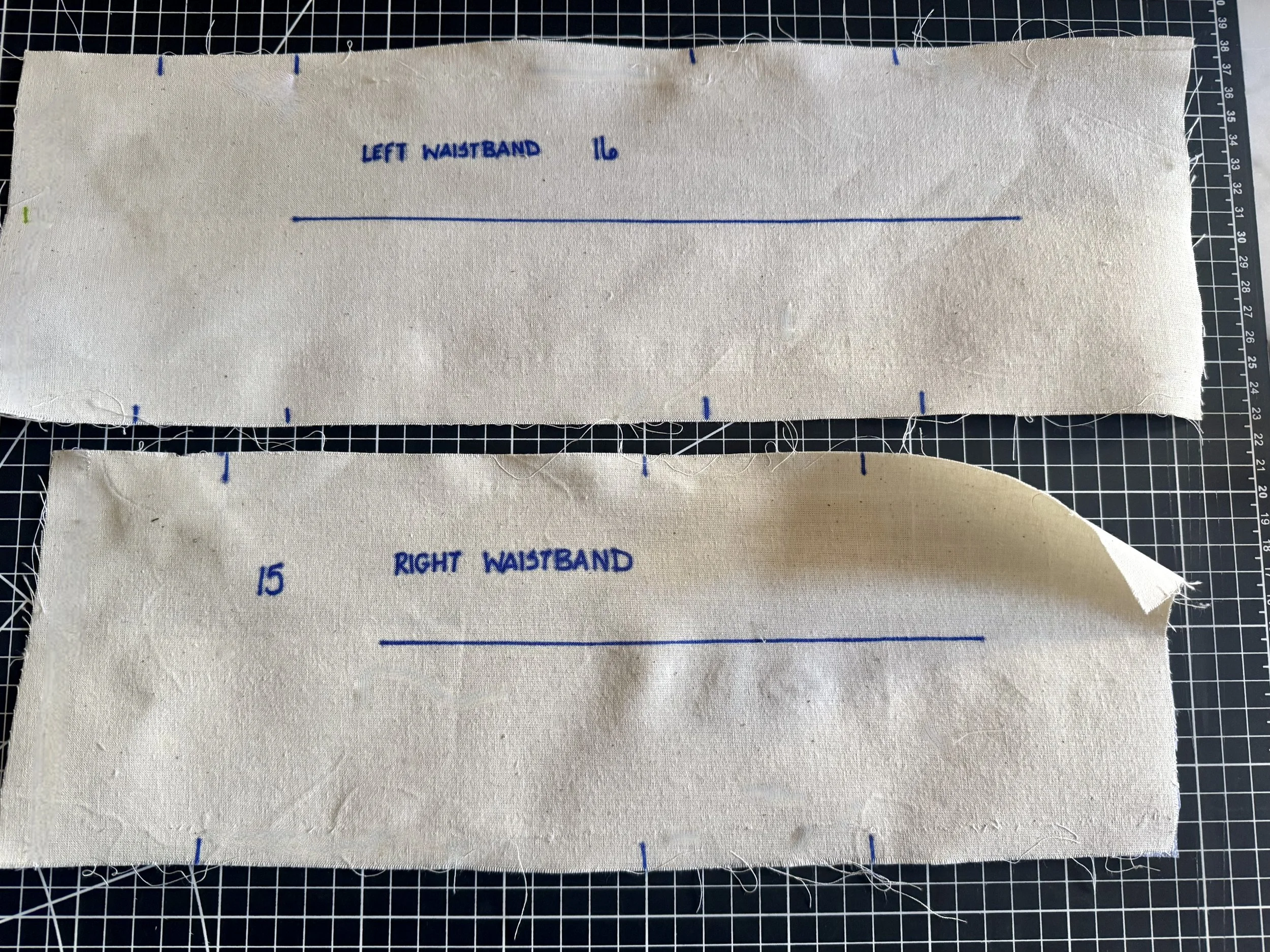 Join the two waistband pieces together. The left piece is longer than the right, as there is an overlap at the waistband zipper edge.