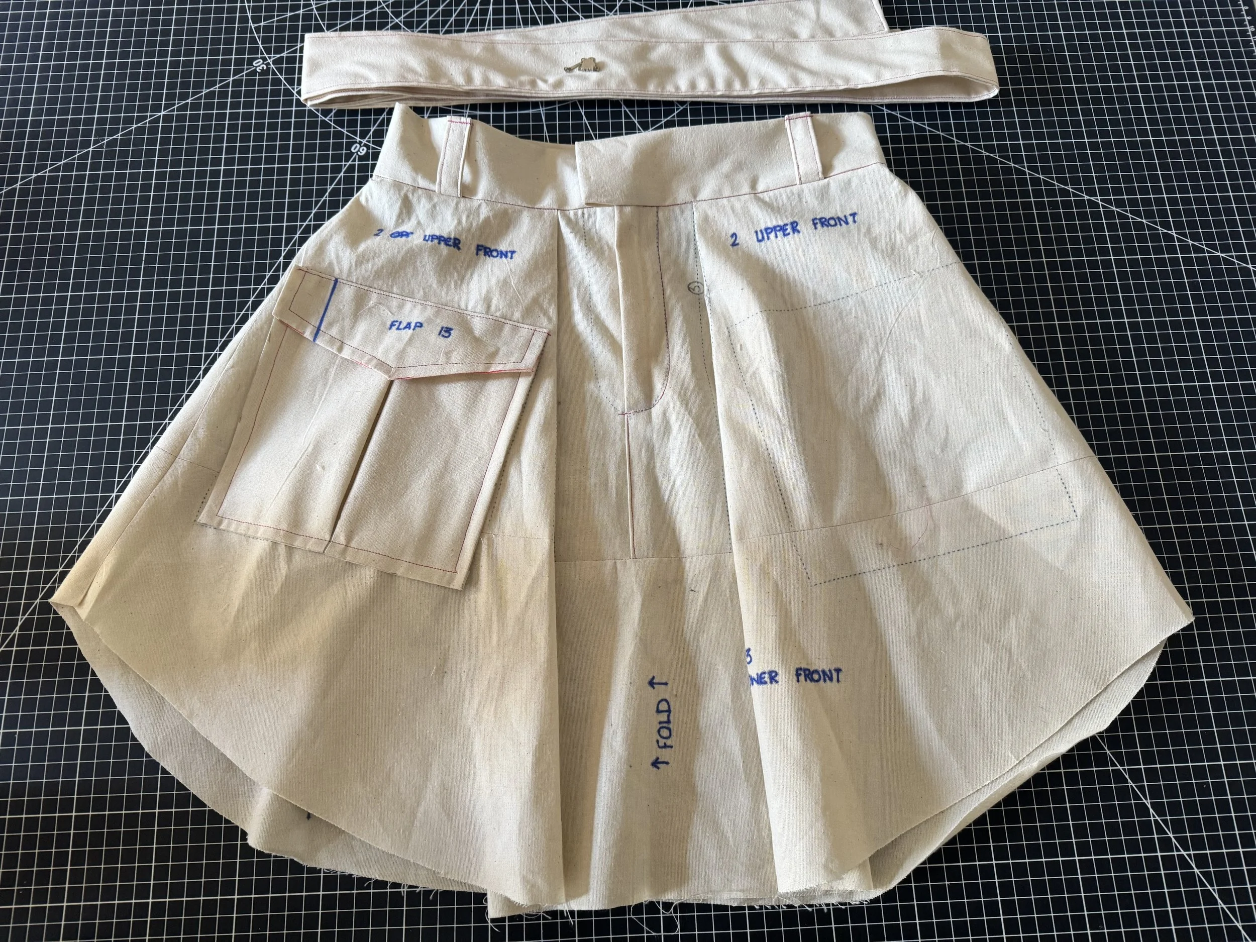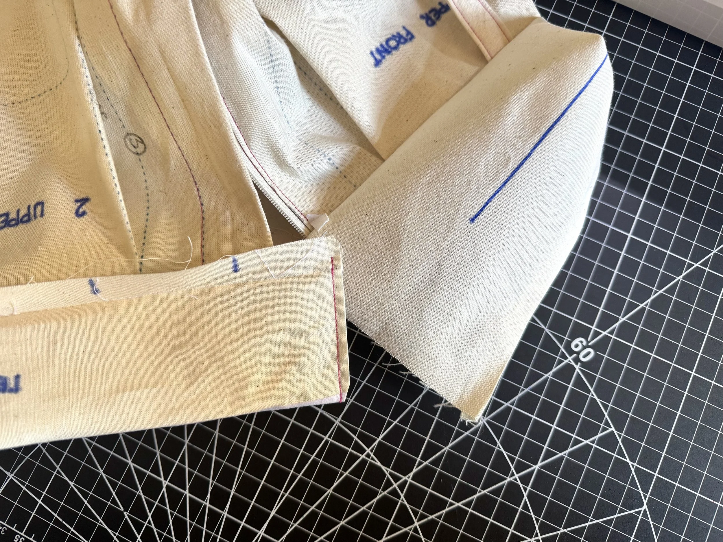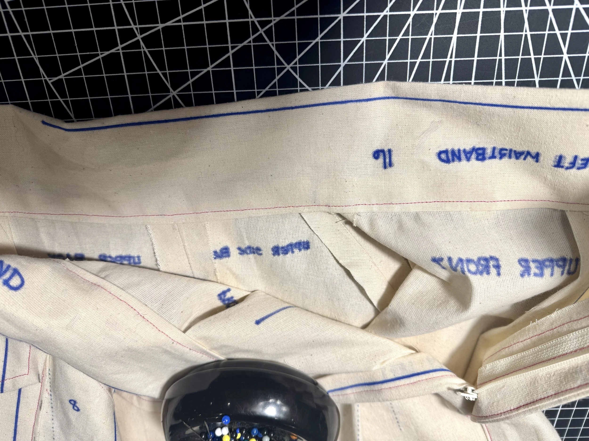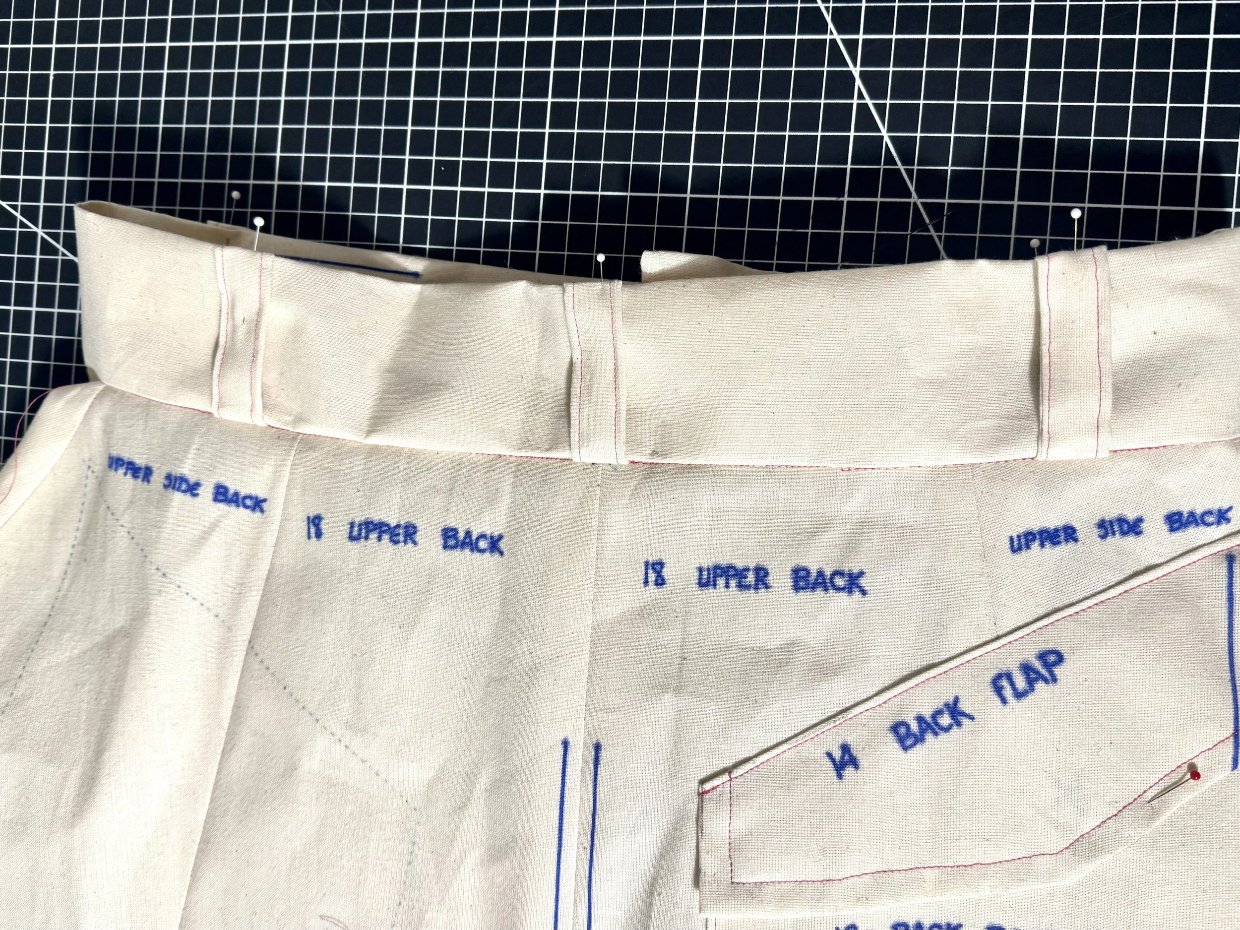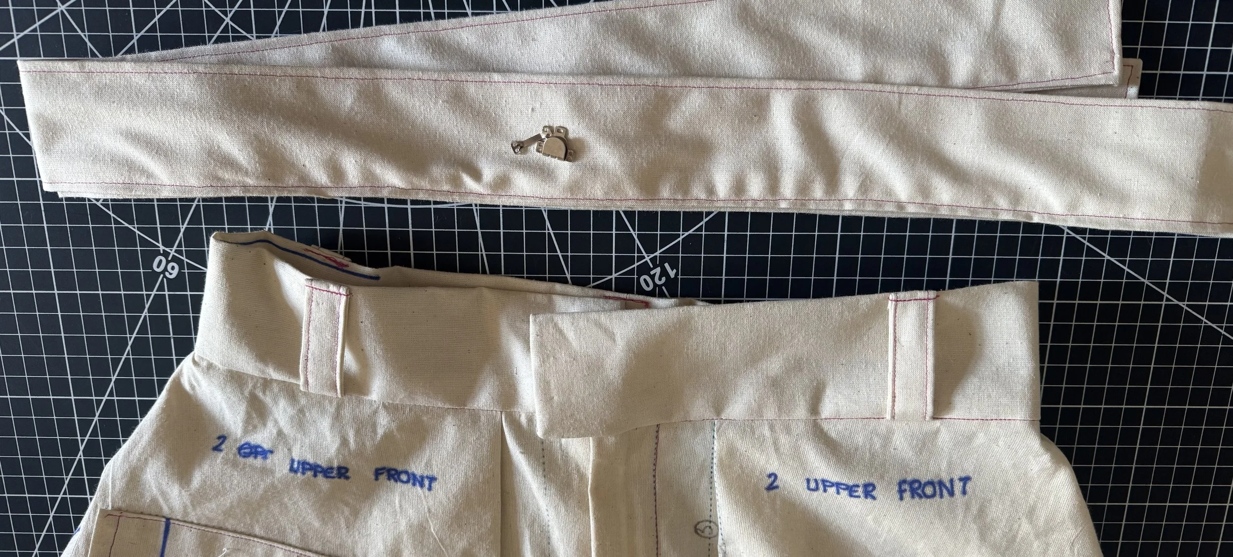 Join the two waistband pieces together. The left piece is longer than the right, as there is an overlap at the waistband zipper edge.