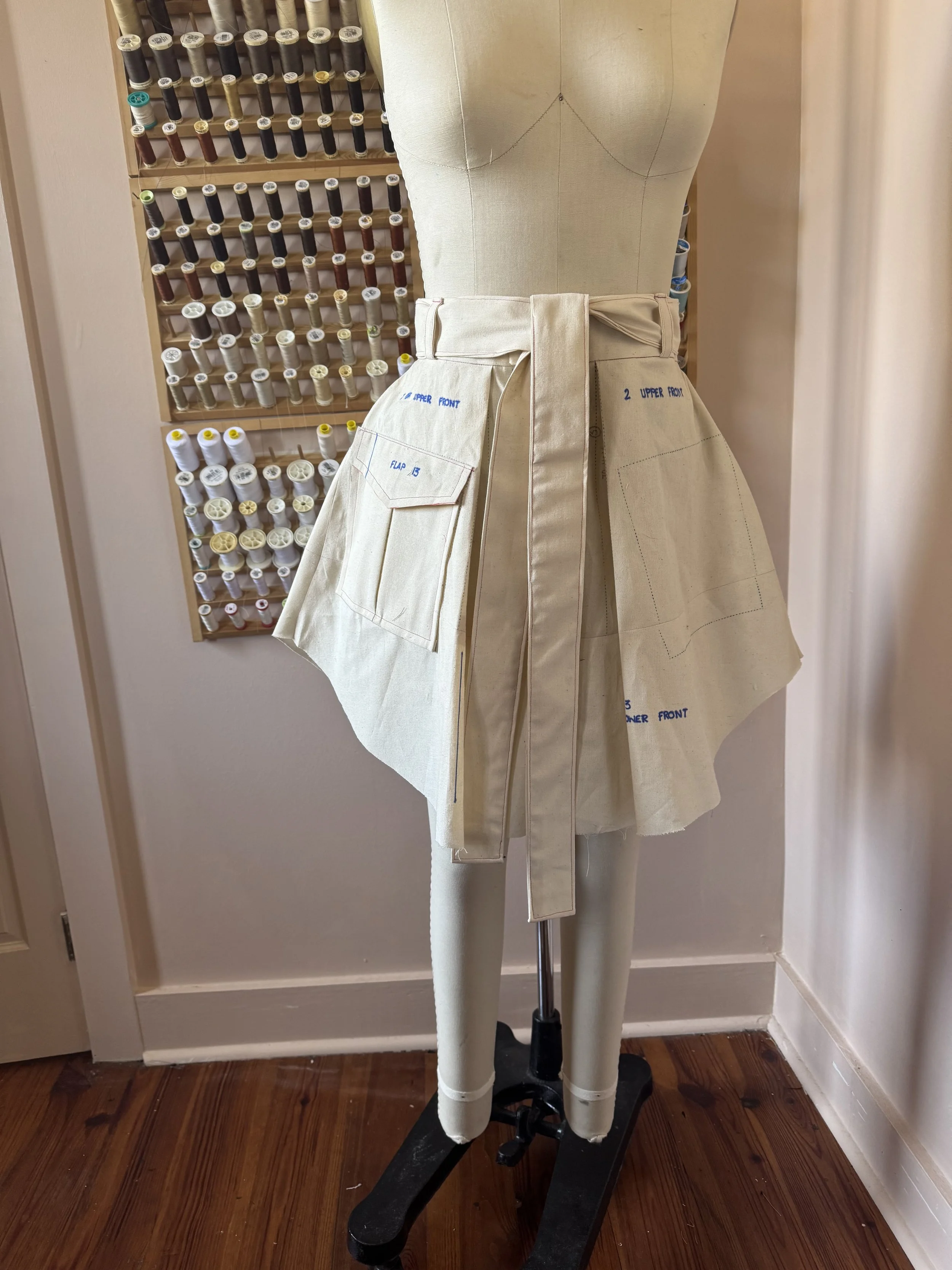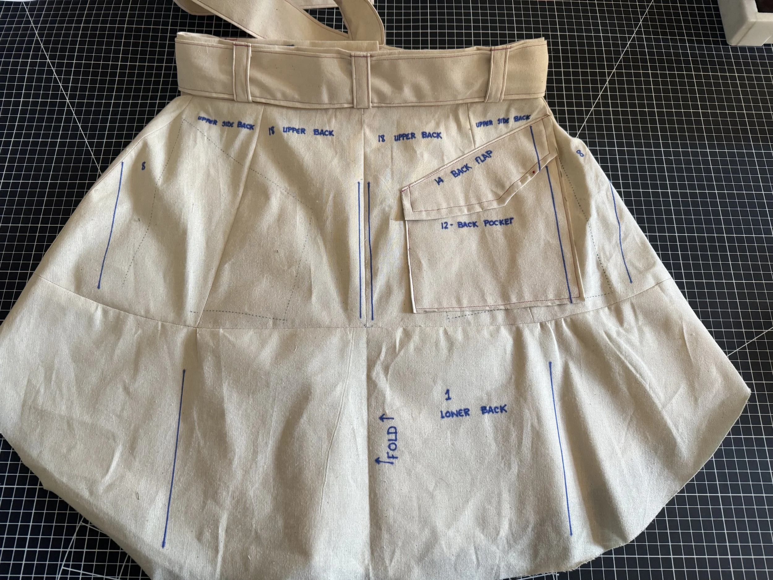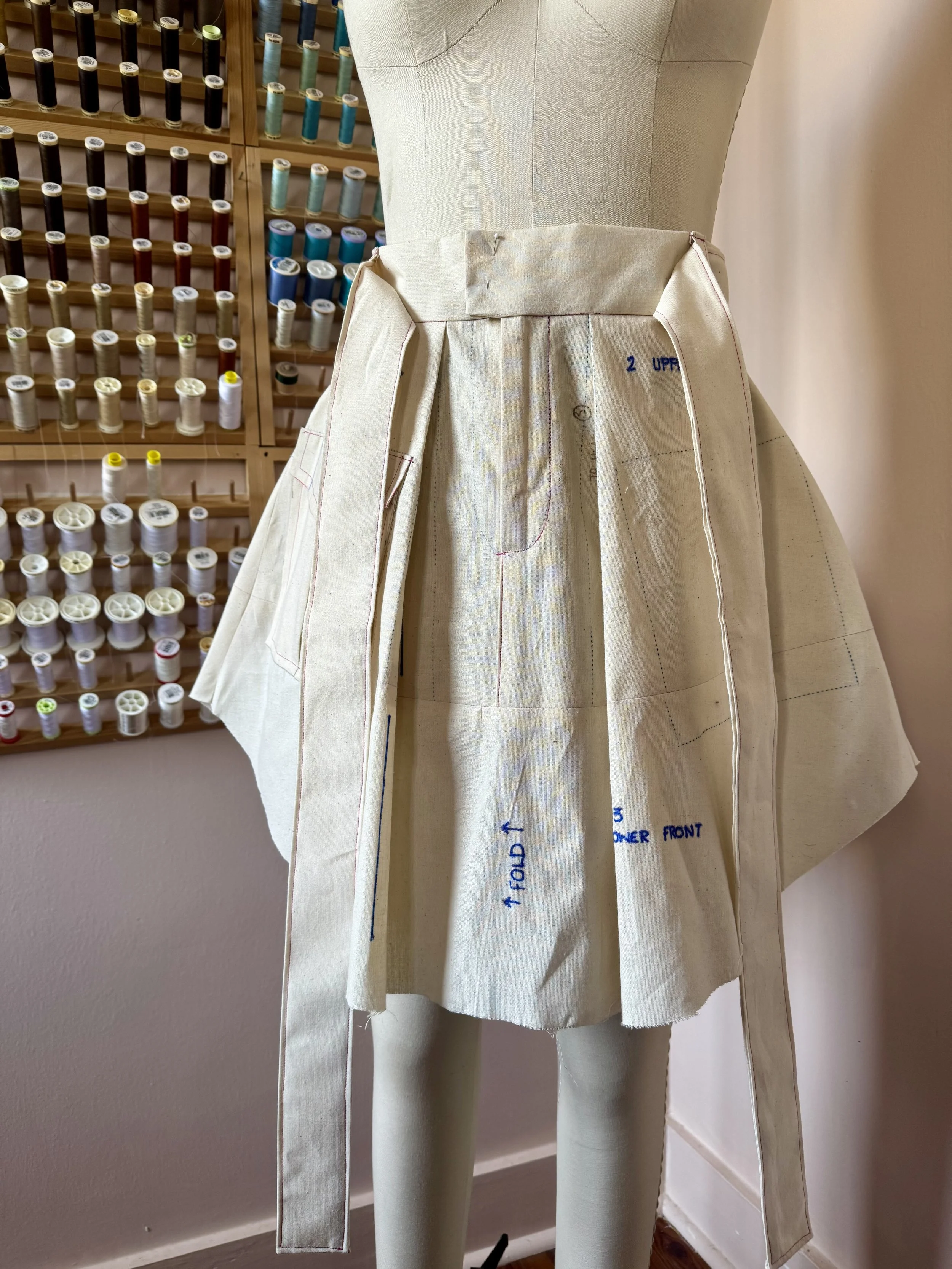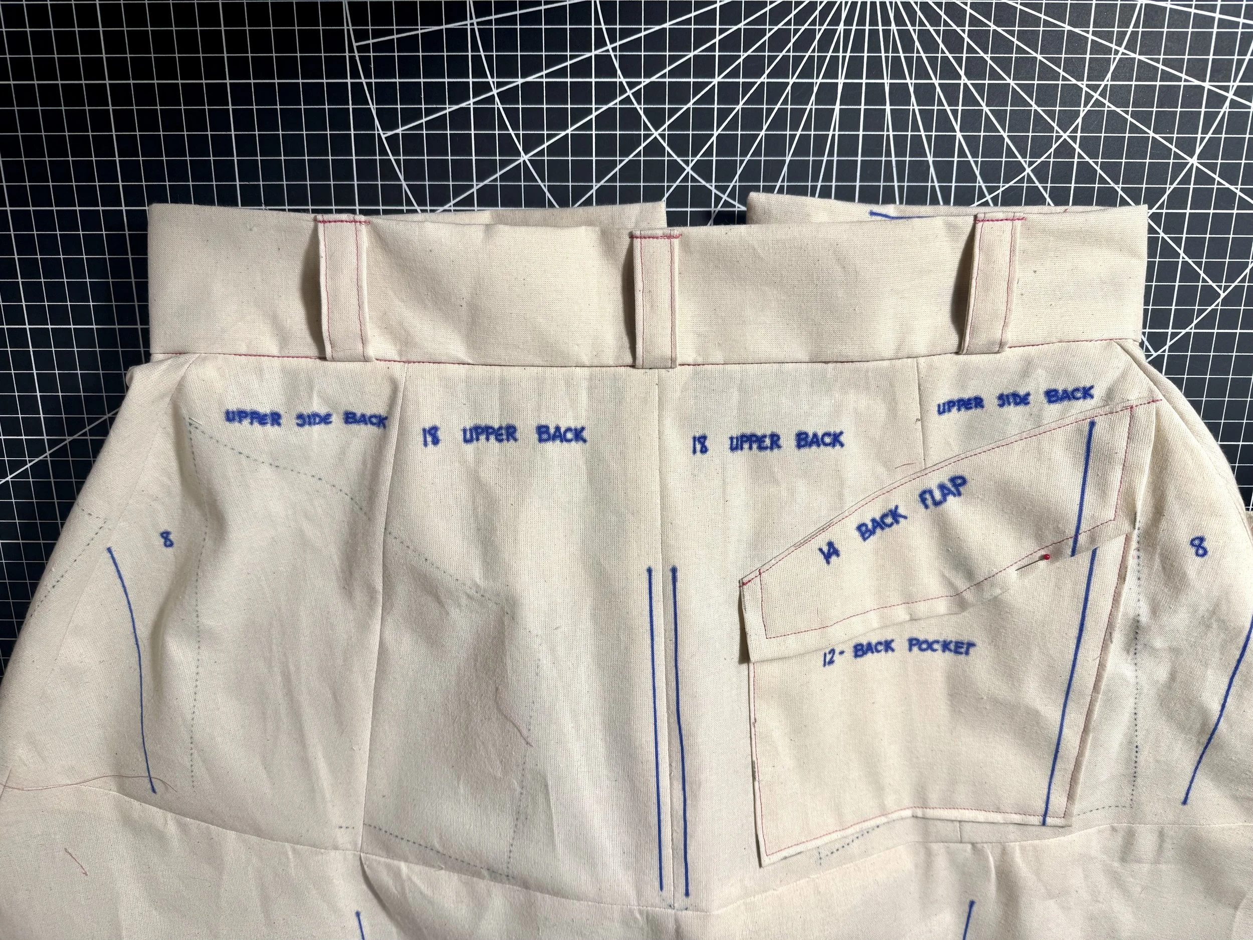Join the two waistband pieces together. The left piece is longer than the right, as there is an overlap at the waistband zipper edge.