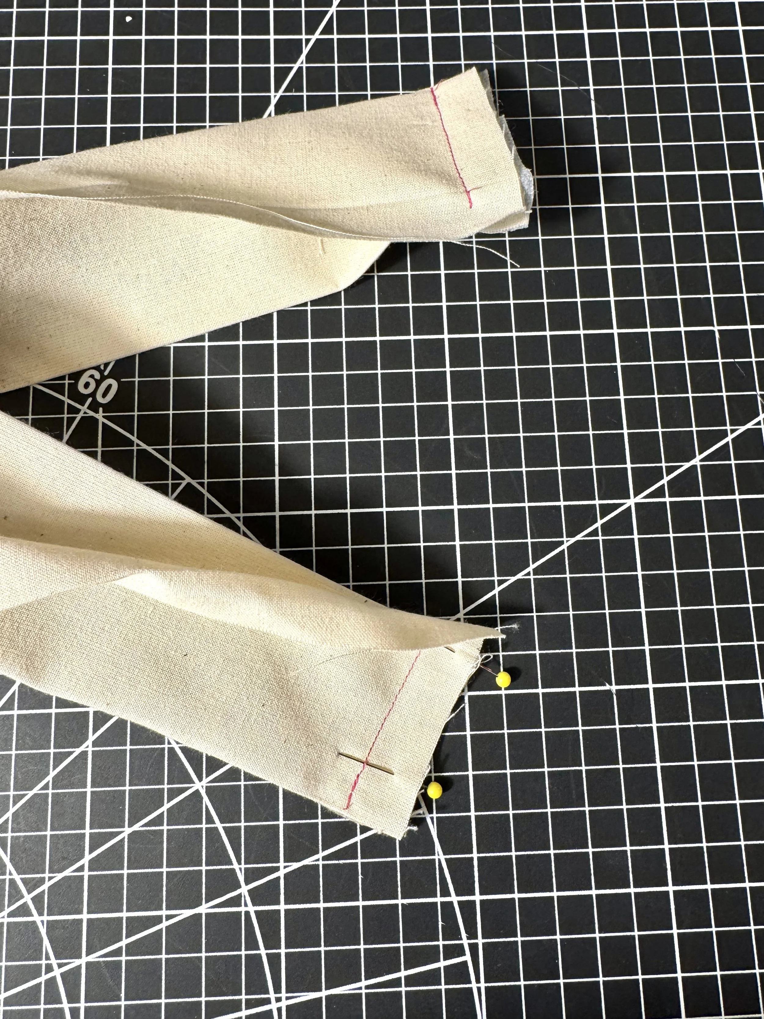 Pin well, checking that your pre-pressed seam overlaps the waistband seam on the outside. We need to catch this when we sew.