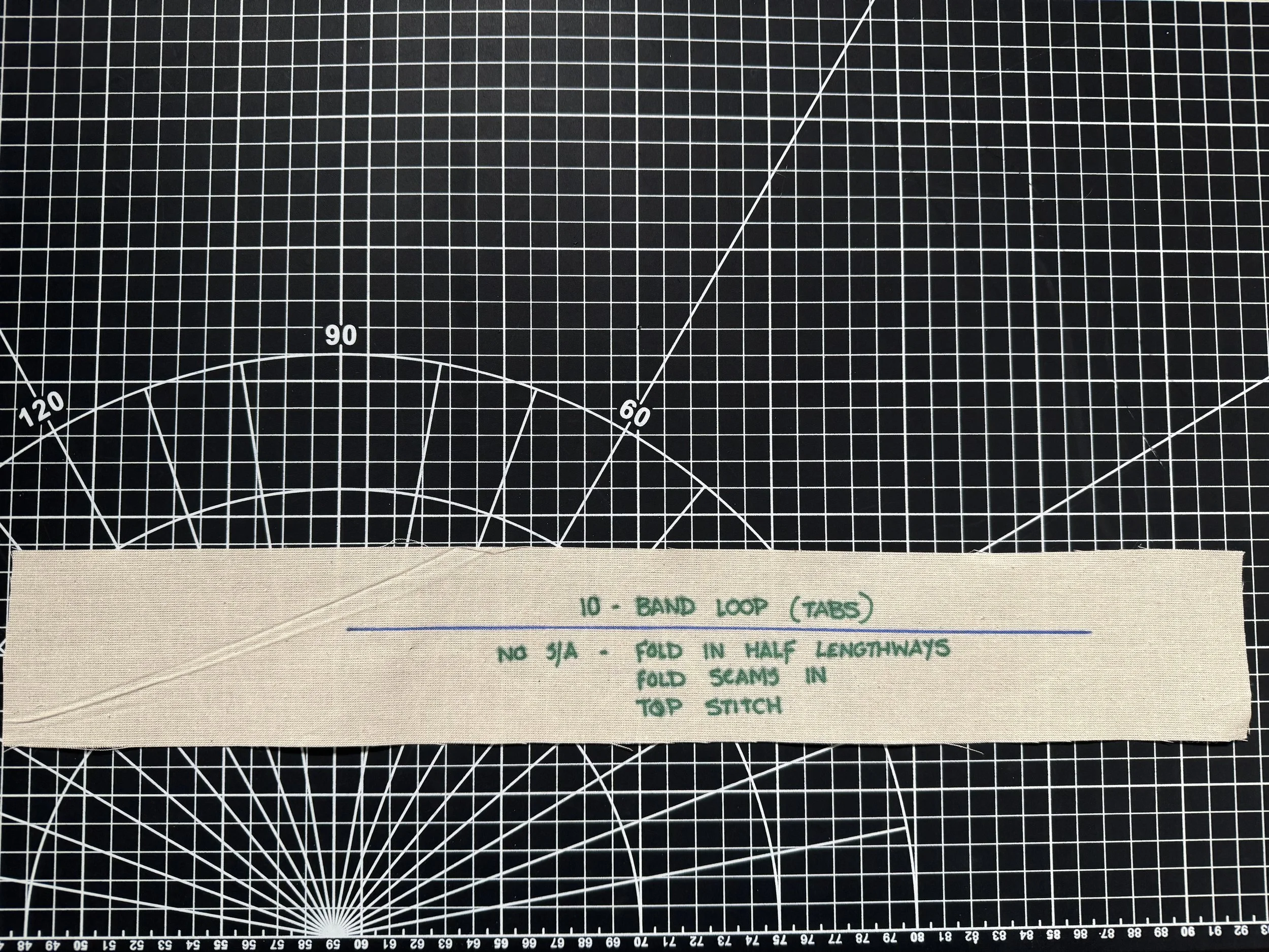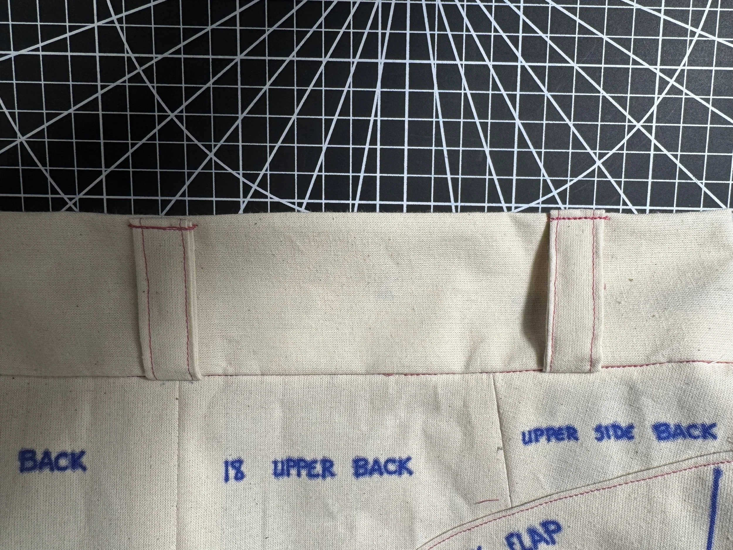 Place your belt tabs at the top of the waistband, and fold the seam in, pin. Trim, if necessary before sewing.