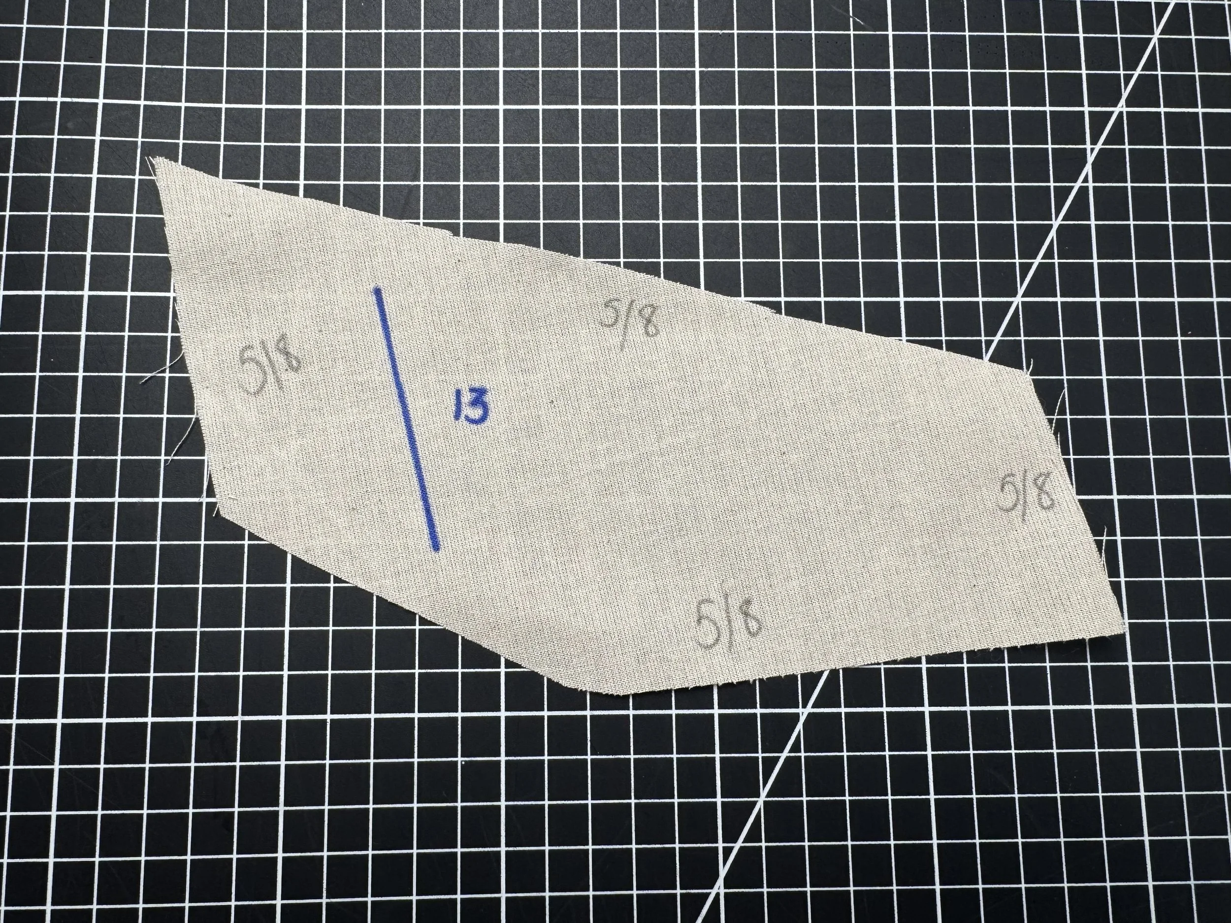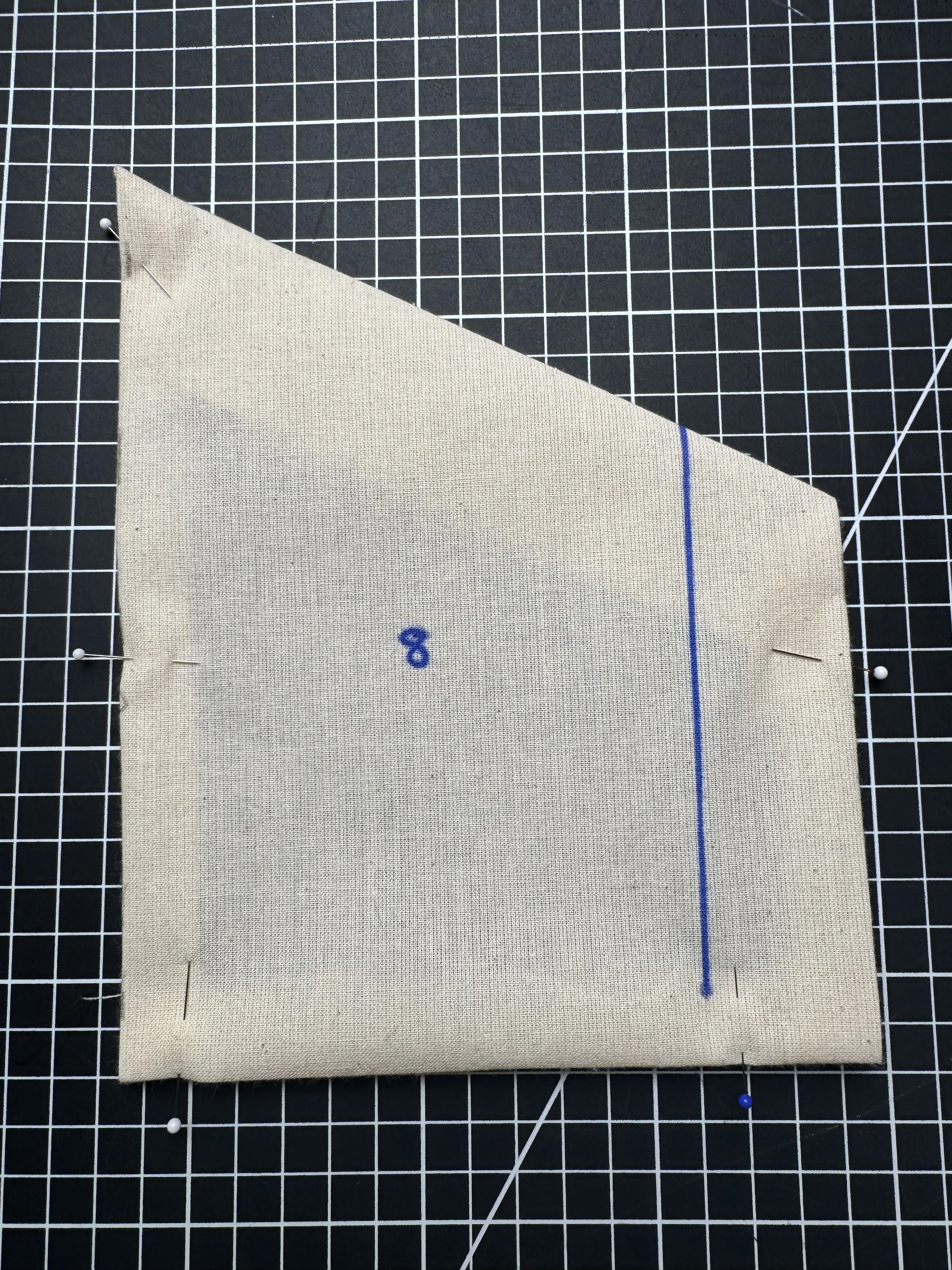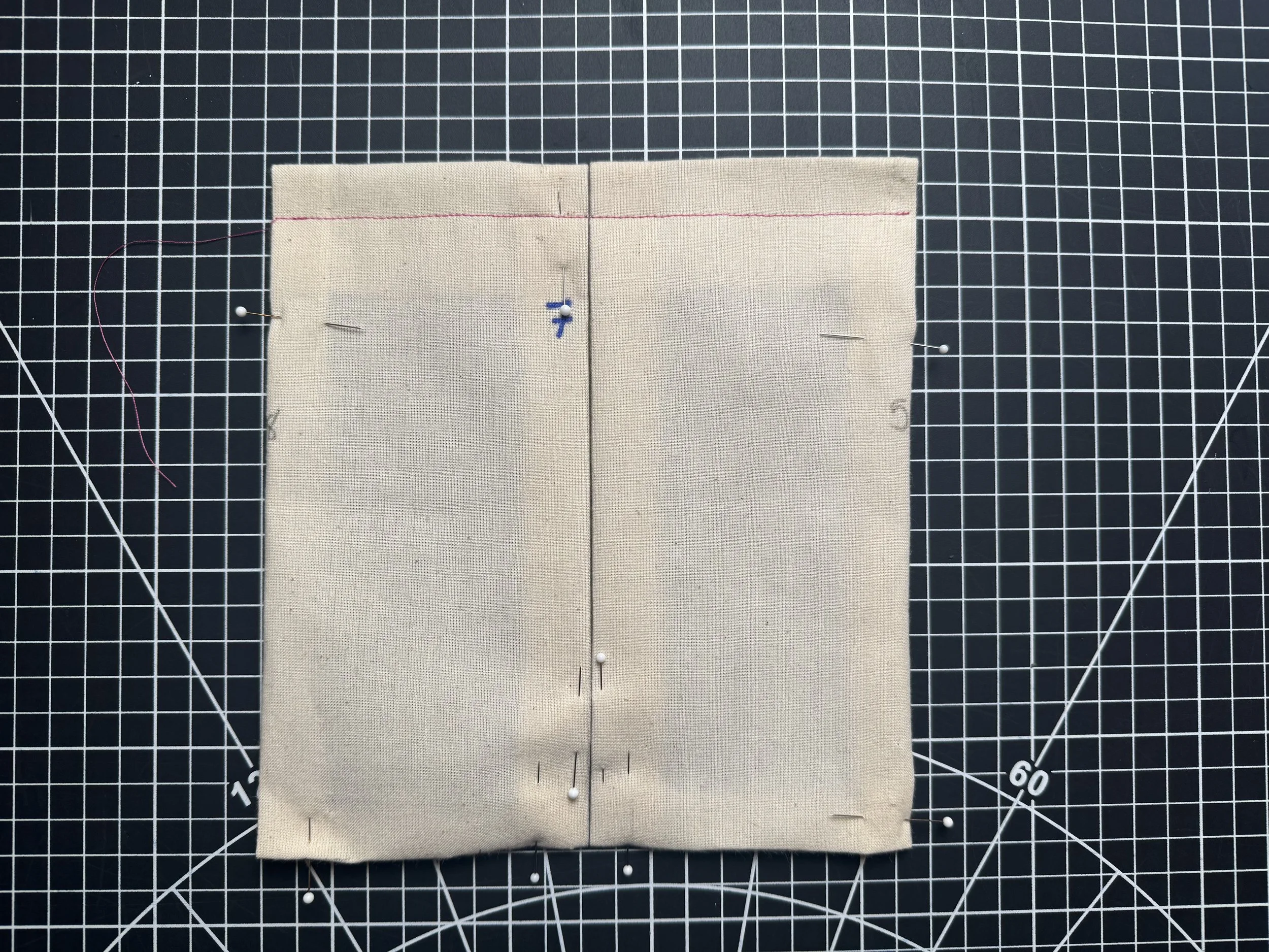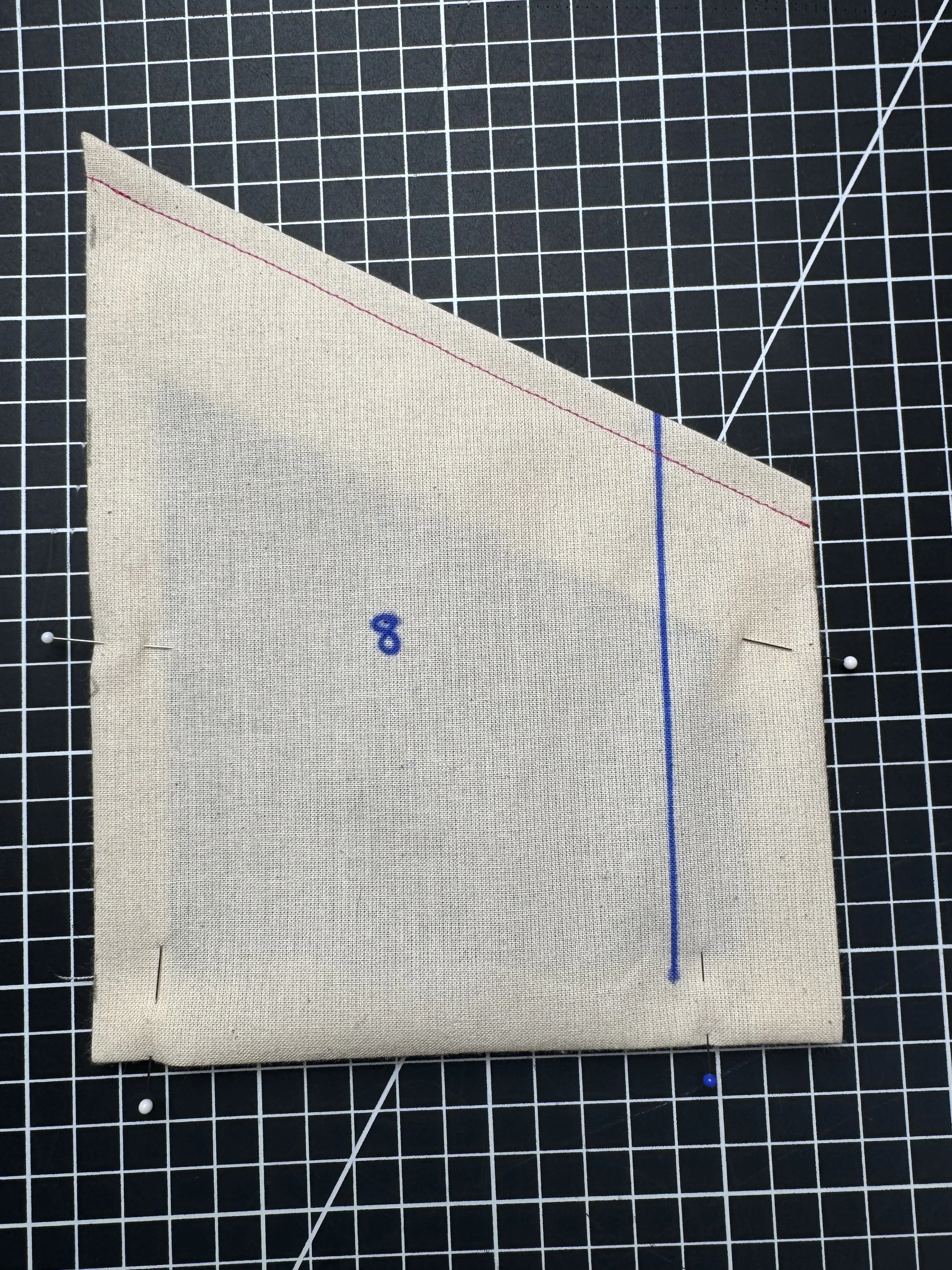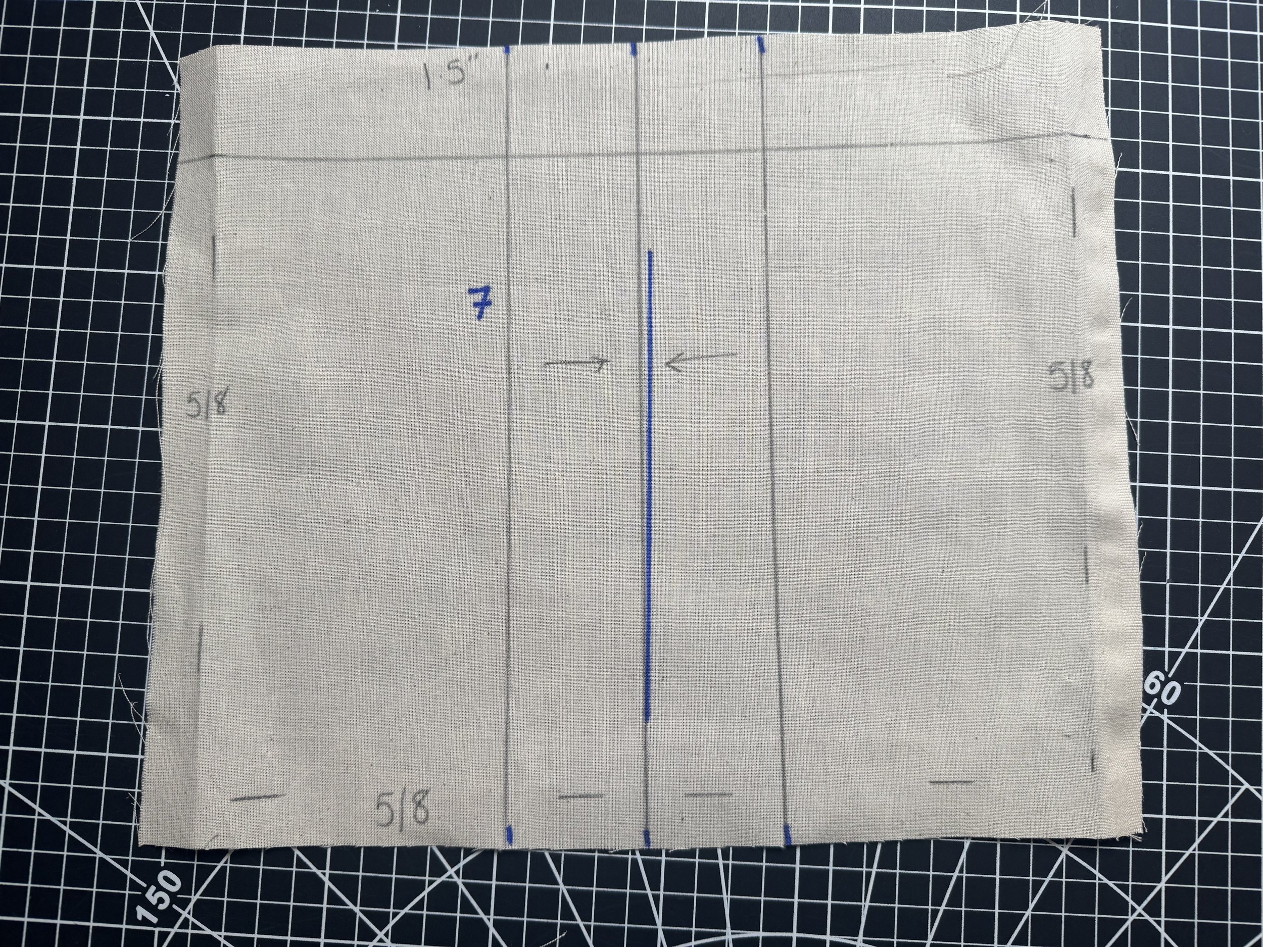 Piece 7 - the front pocket, has a pleated center, which is marked on the pattern as shown. The seam allowance is 5/8โ around all three edges, and 1.5โ on the top fold. Line and interface if your fabric is lighter.