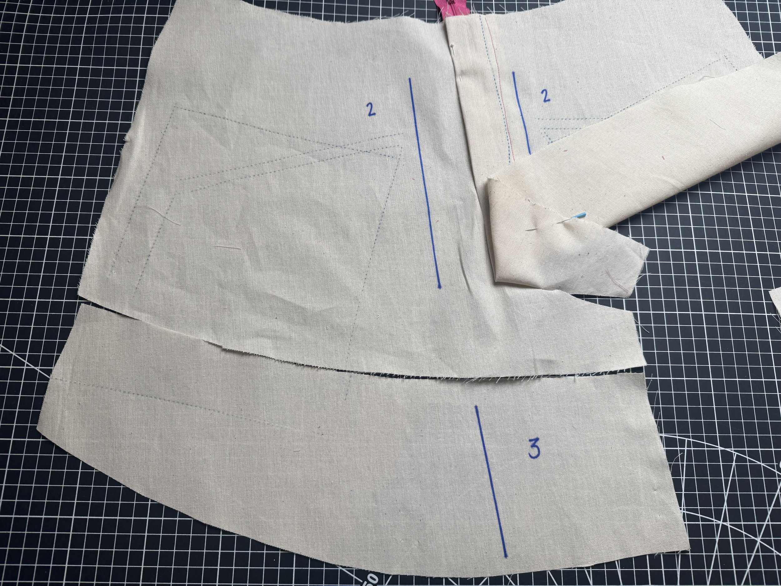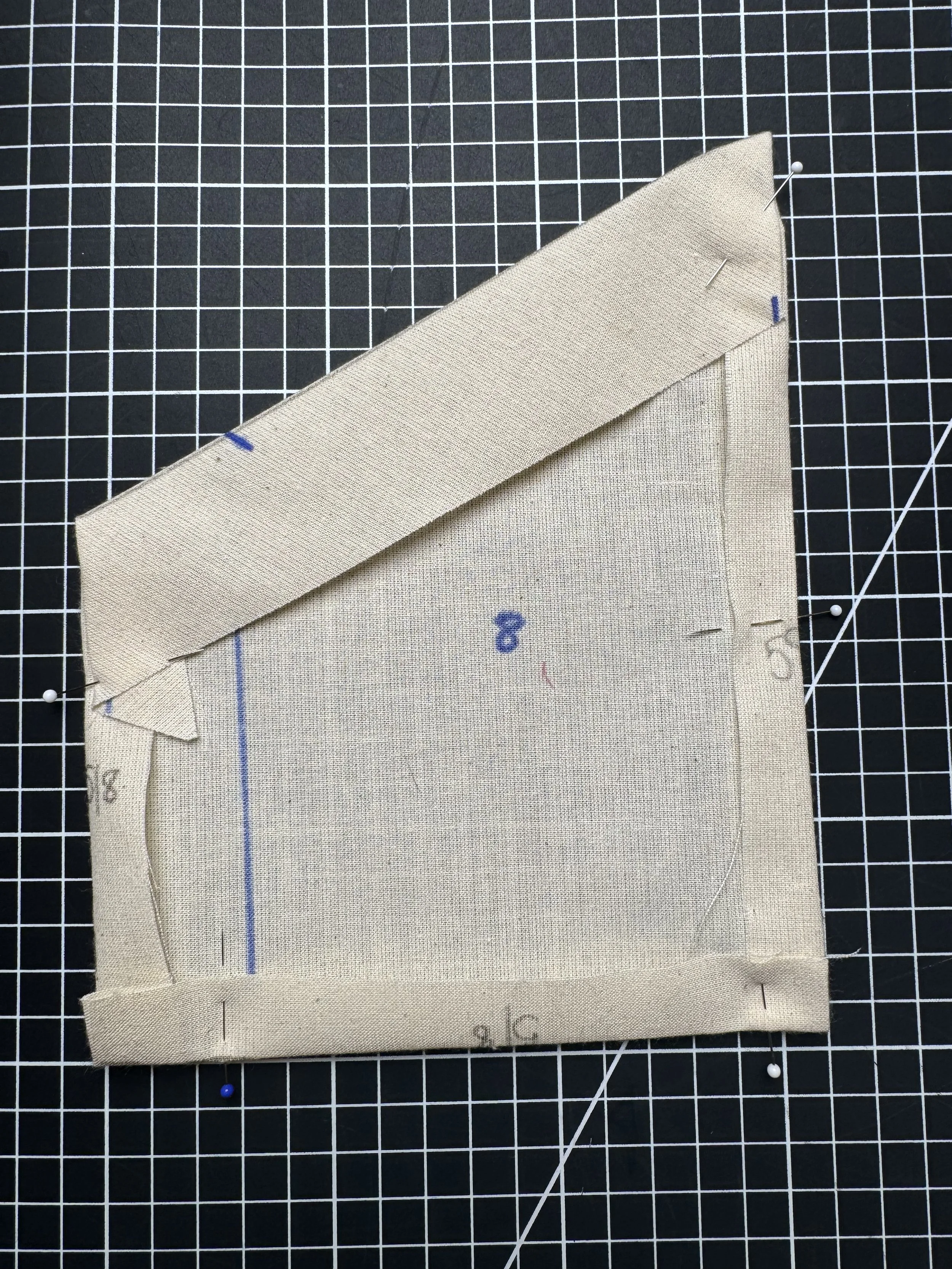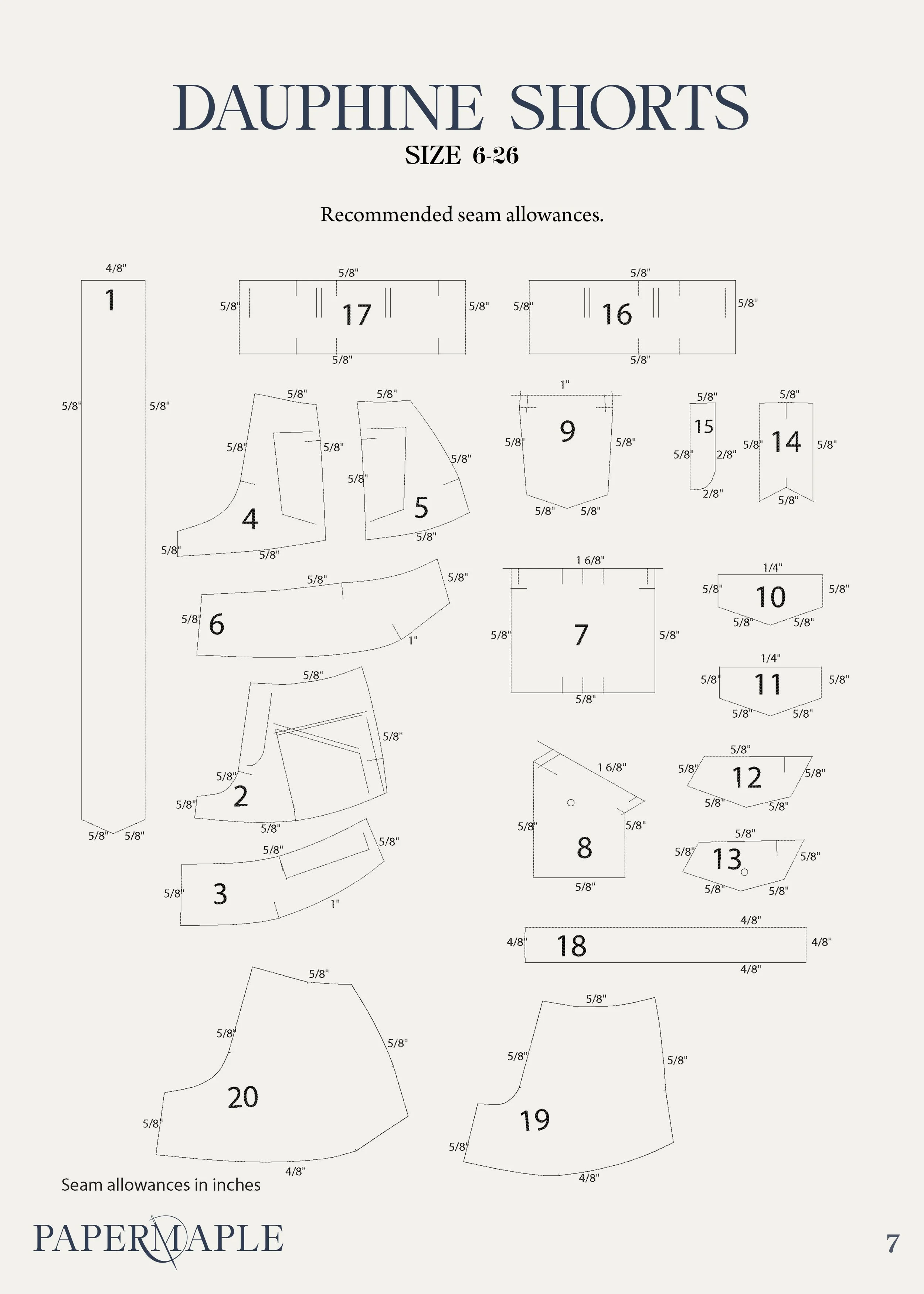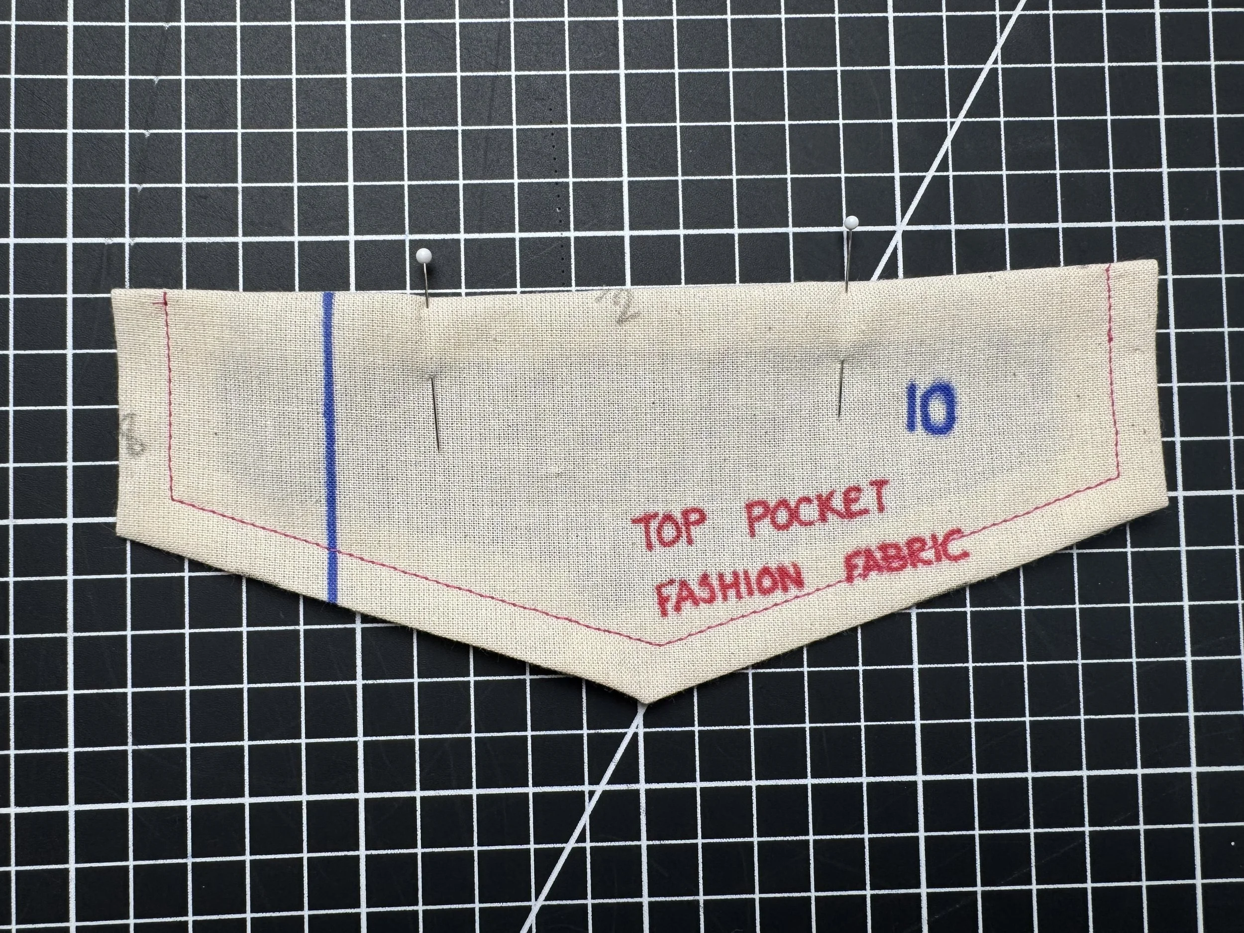 We have included two pocket options for the front skirt - piece 8 is a smaller, angled pocket with 5/8โ seams along the sides and bottom, and a fold over over 1.5โ at the top.