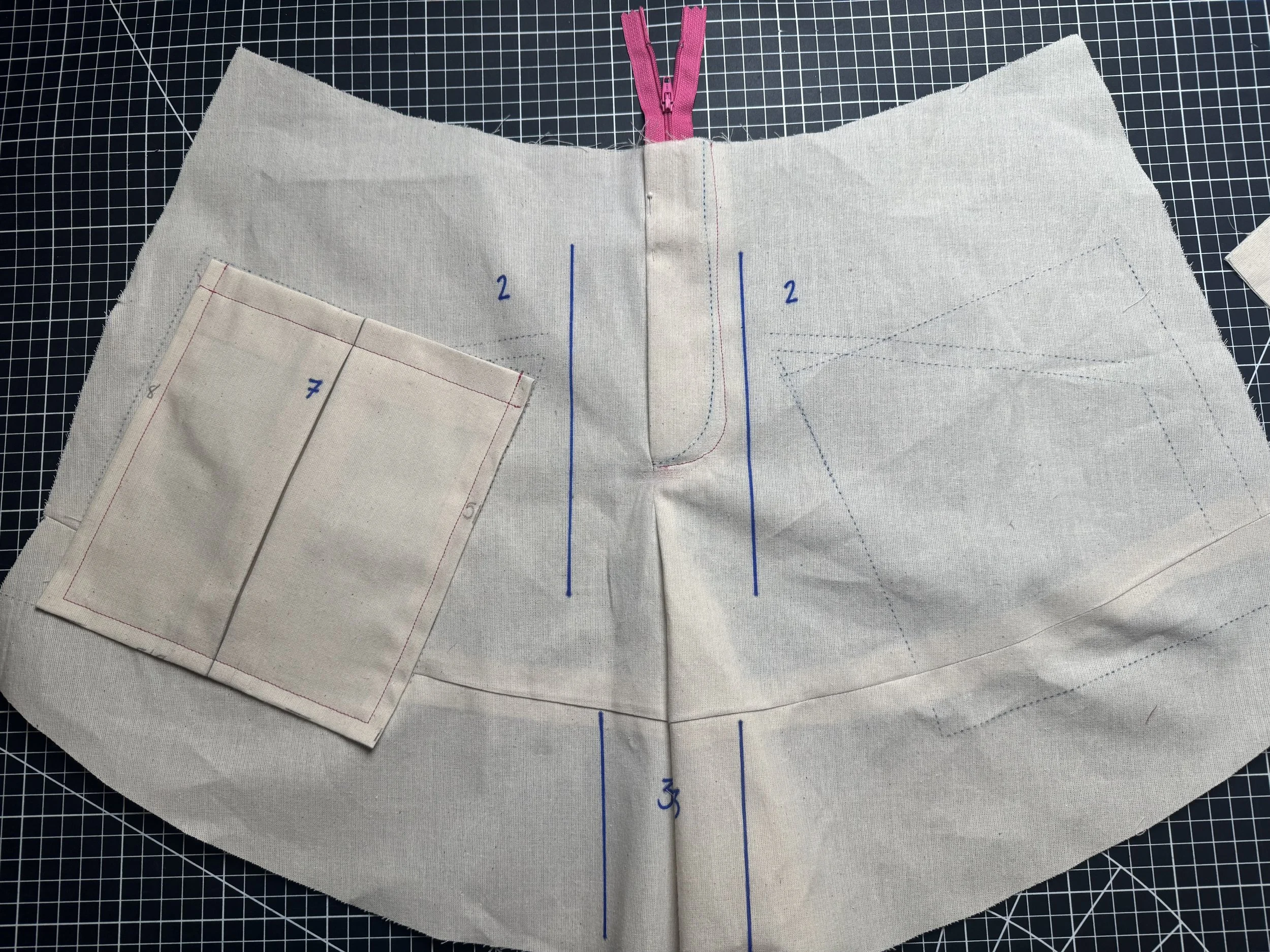 Pin the pocket to the skirt following the guide on the pattern and topstitch both sides and the bottom edge.