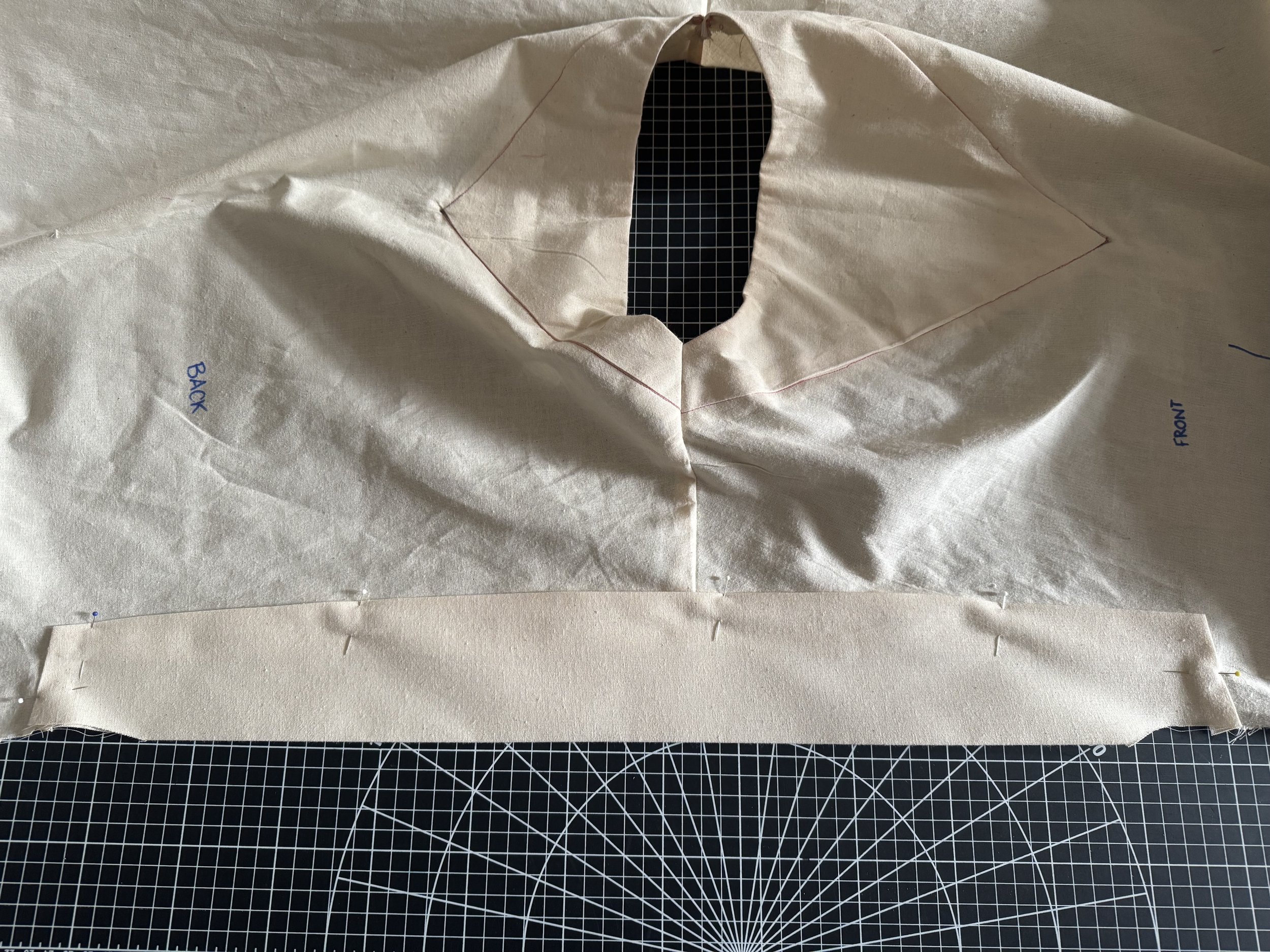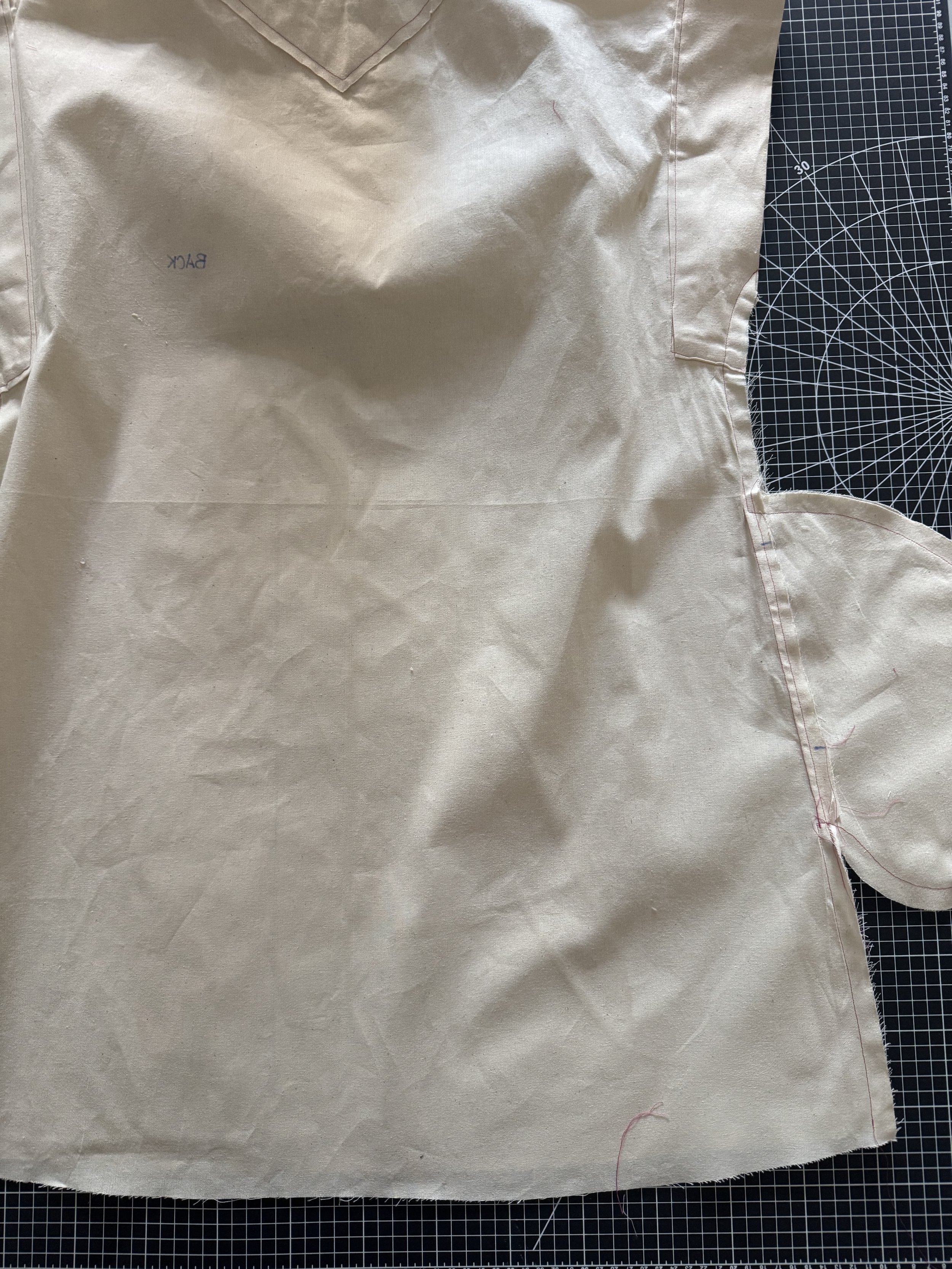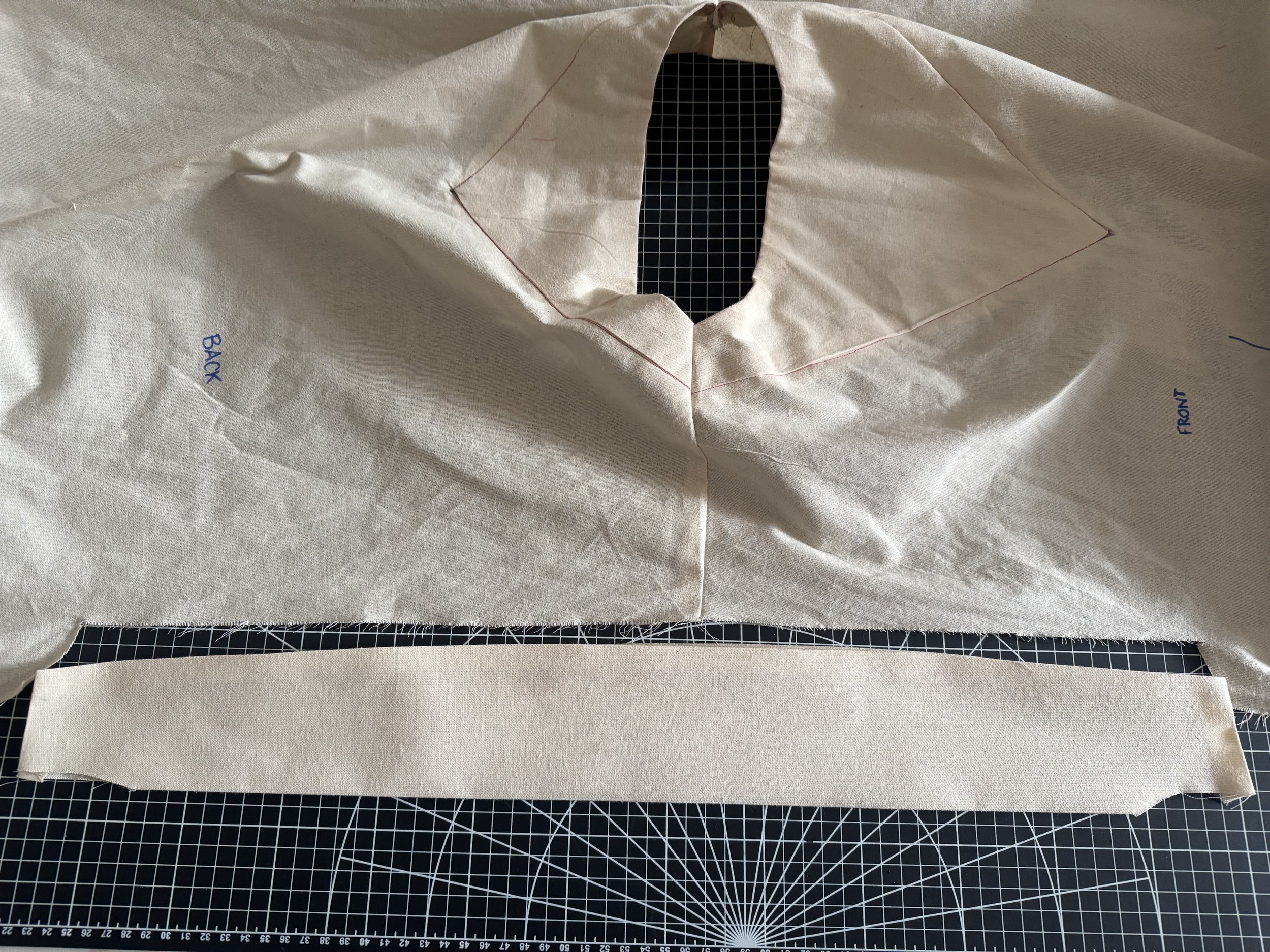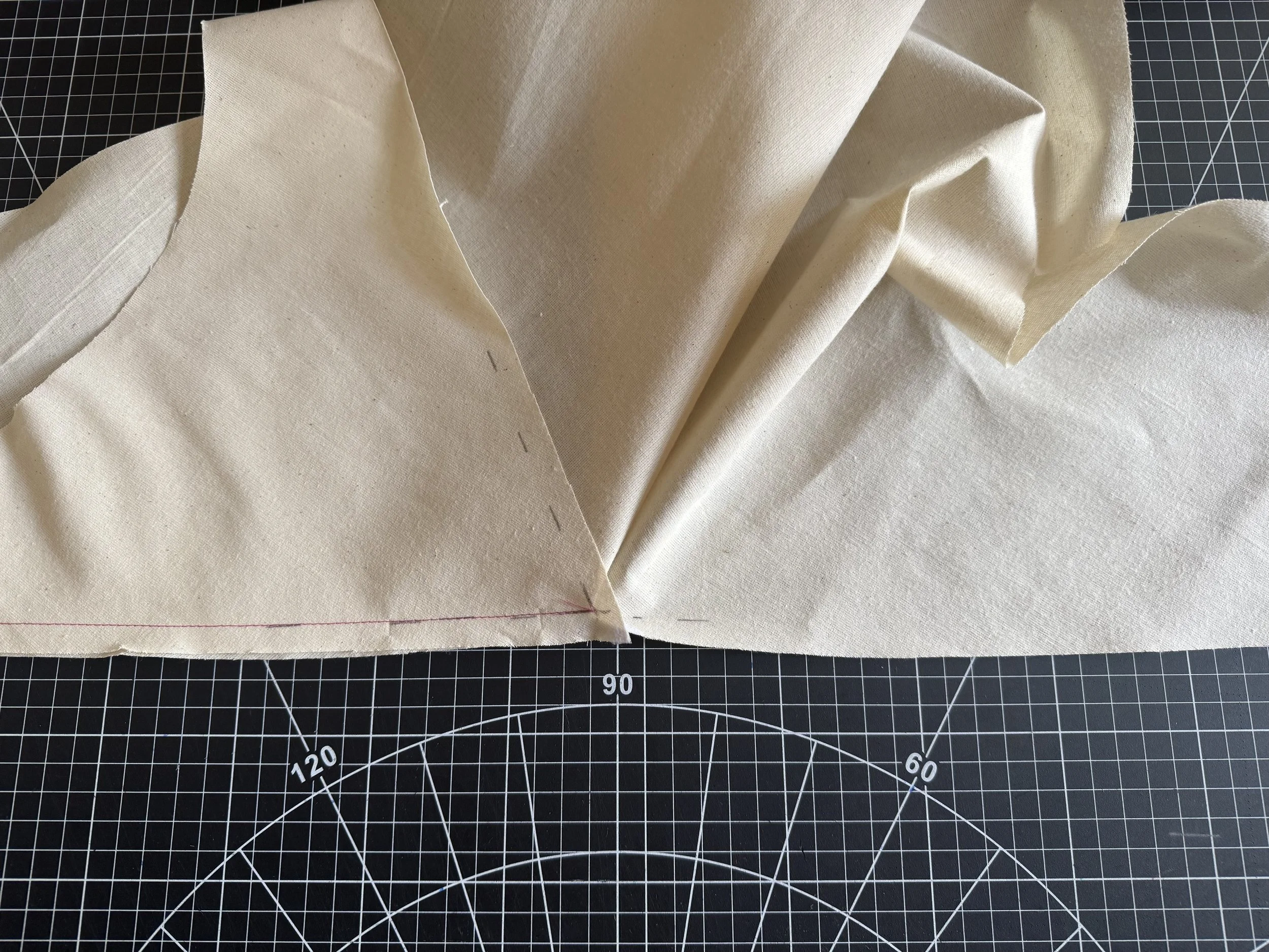 I’m demonstrating on a starched medium weight muslin. I would suggest a light to medium weight fabric for a beginner, as the area where the sleeves intercept with the side seams can be thick and become a little more difficult to sew.