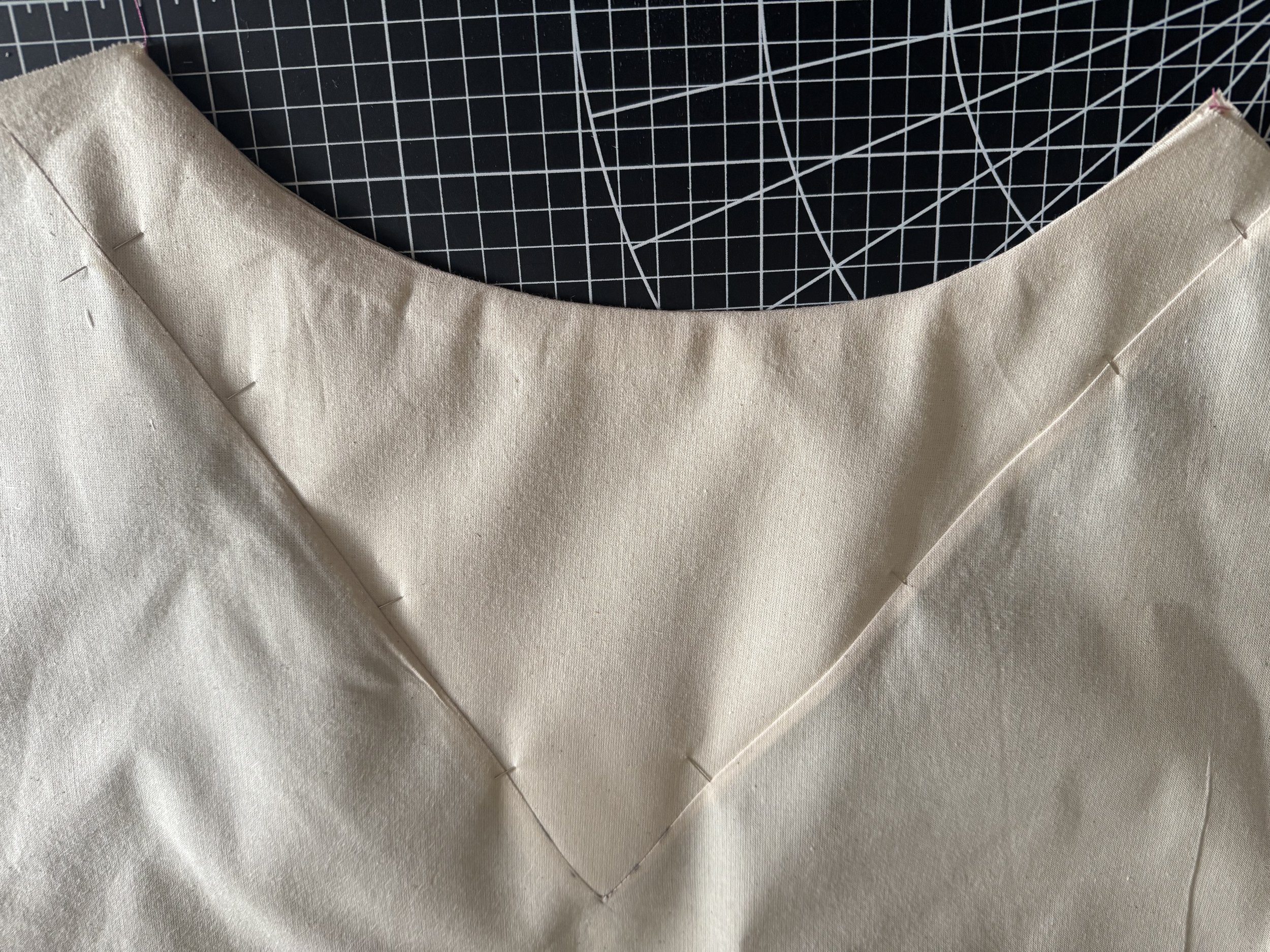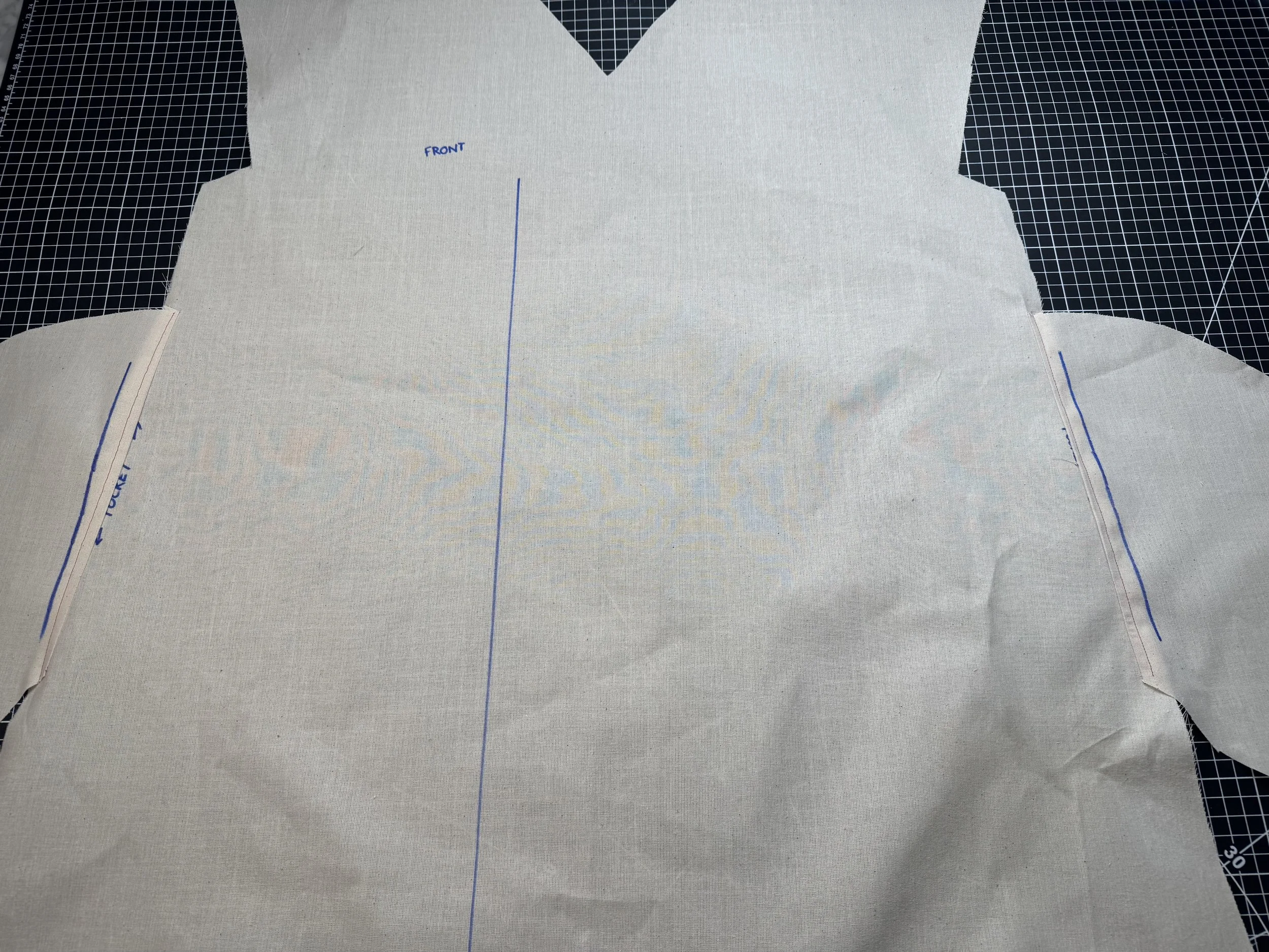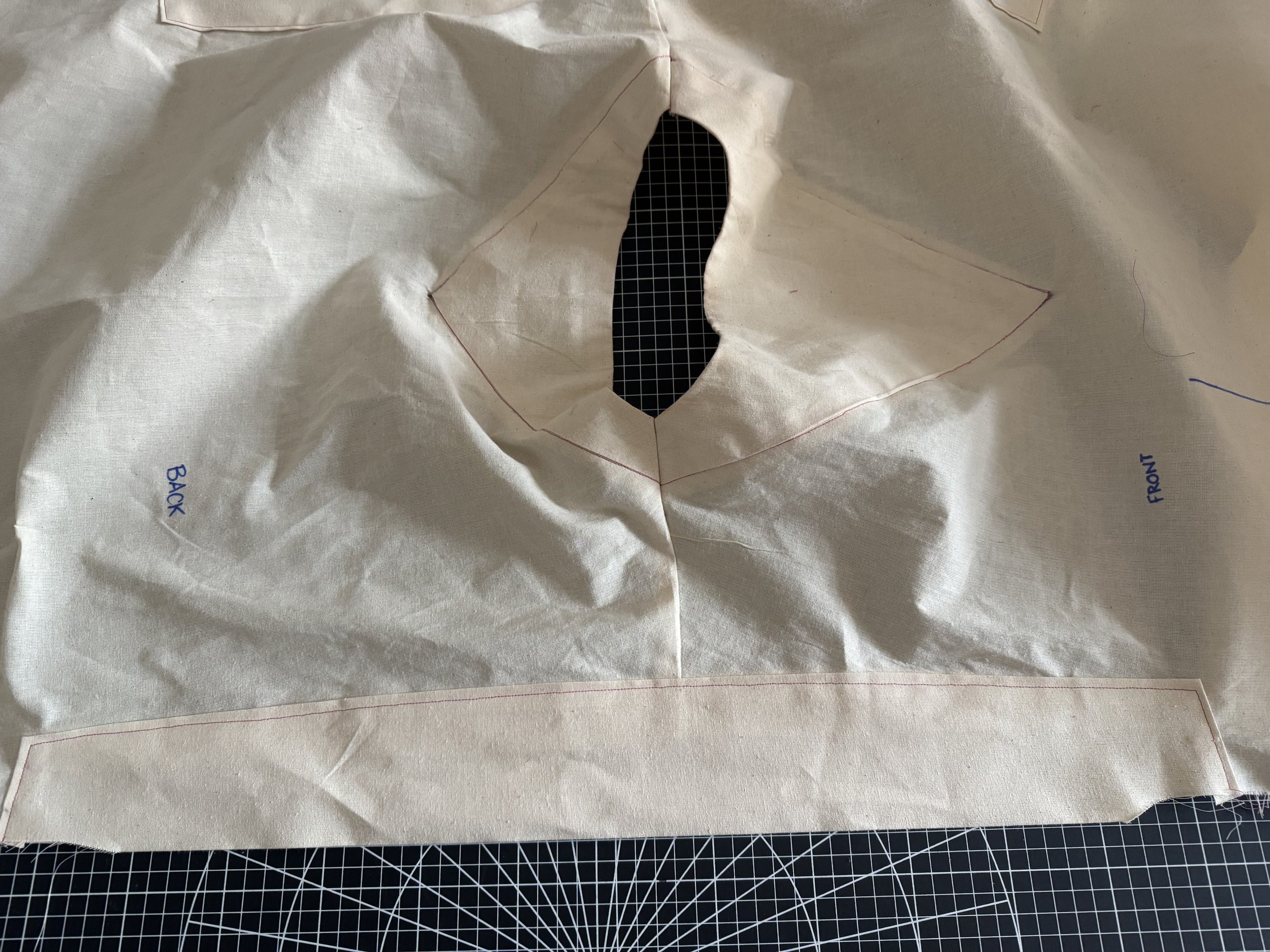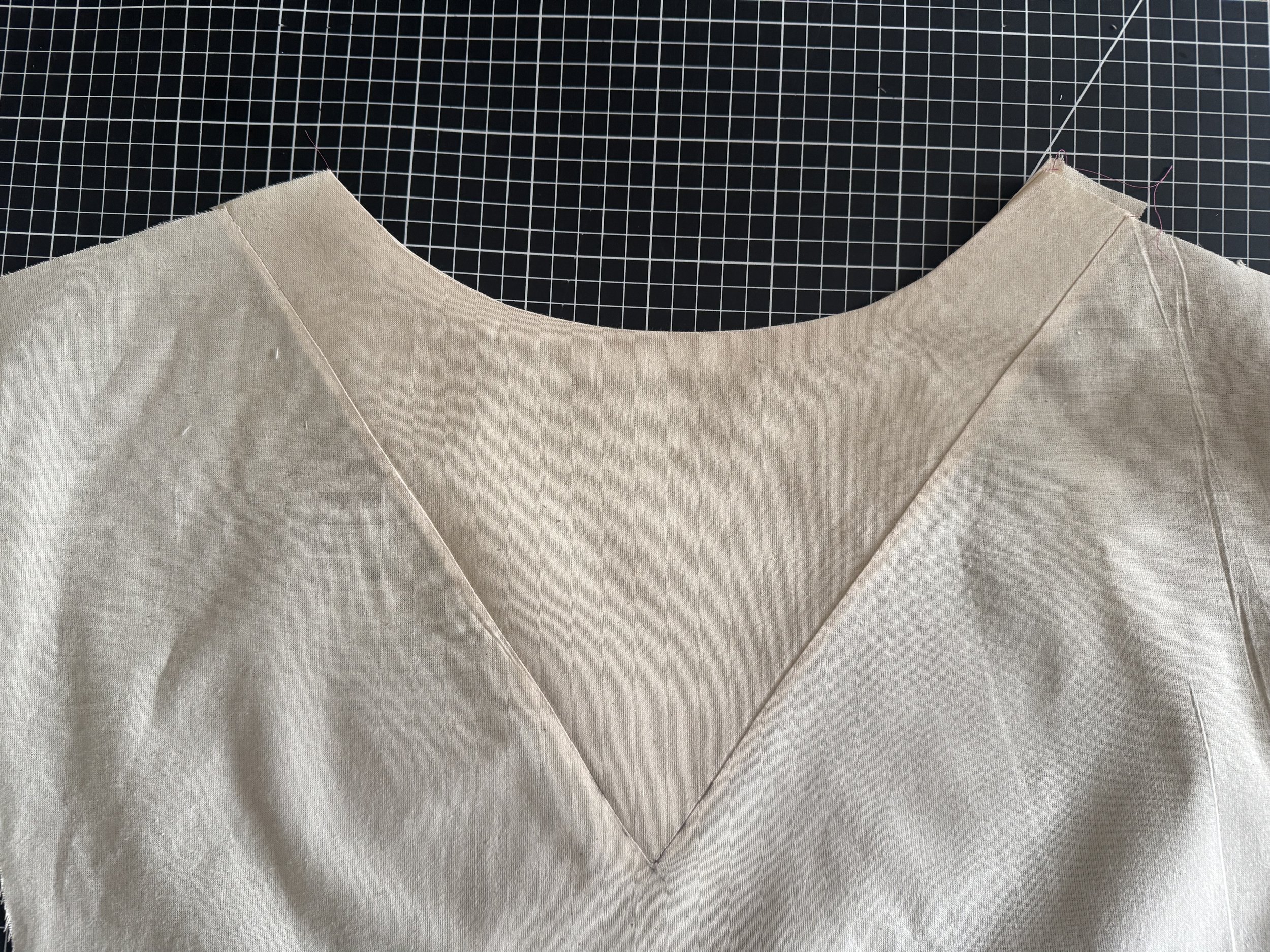 I’m demonstrating on a starched medium weight muslin. I would suggest a light to medium weight fabric for a beginner, as the area where the sleeves intercept with the side seams can be thick and become a little more difficult to sew.