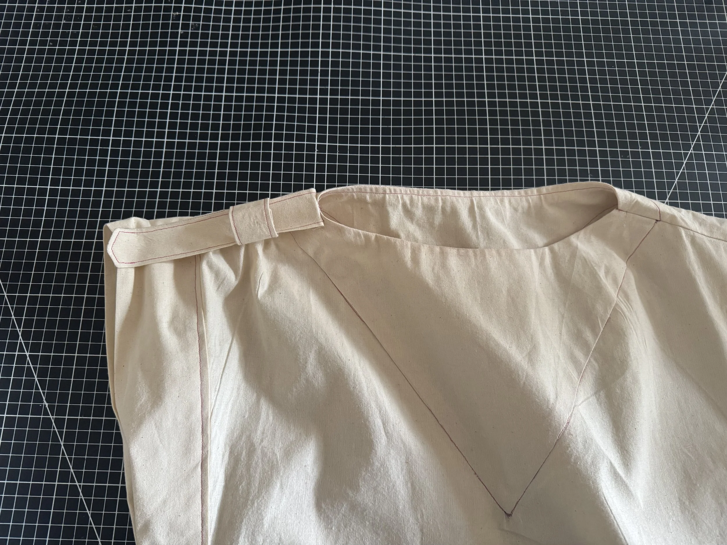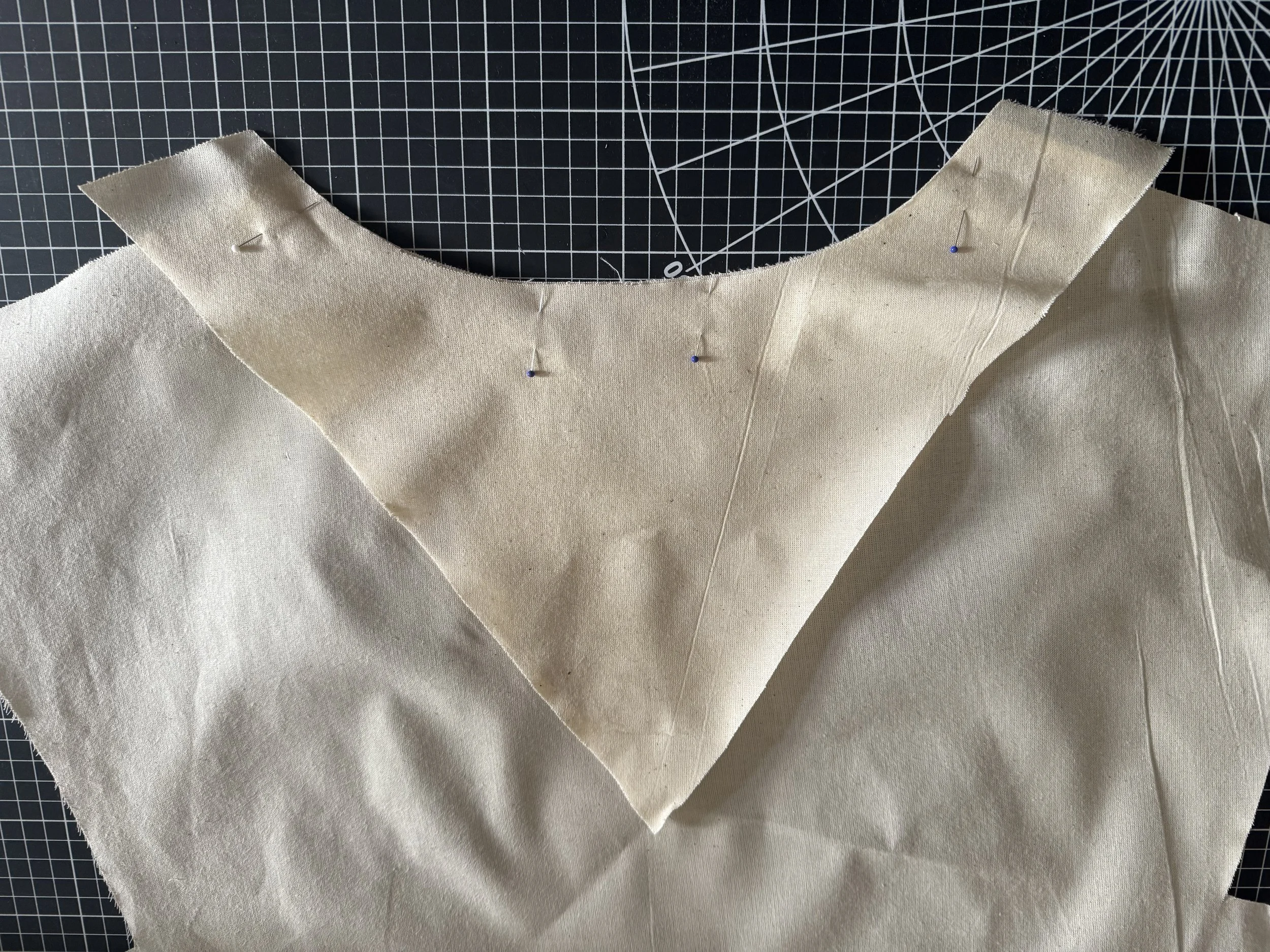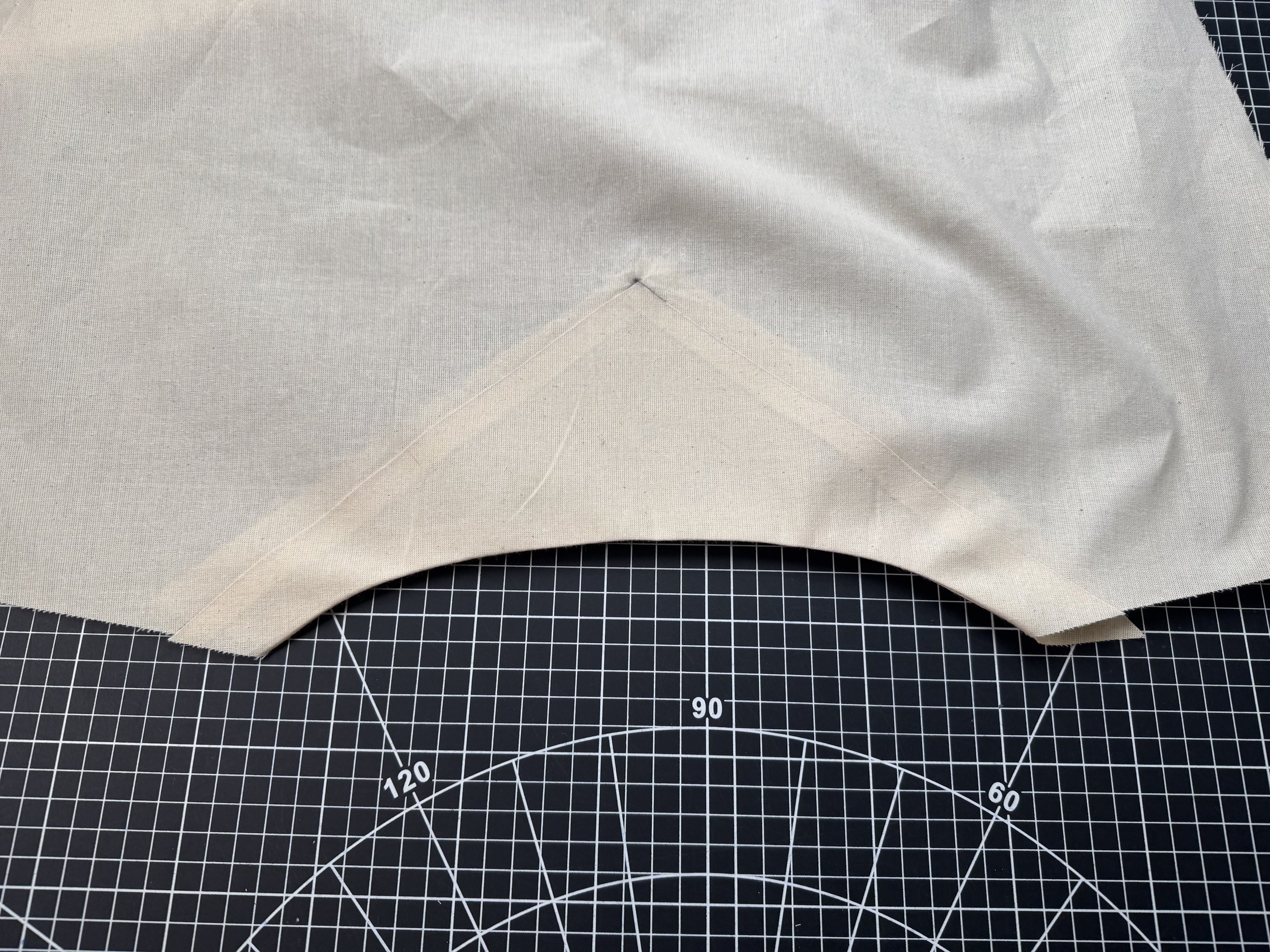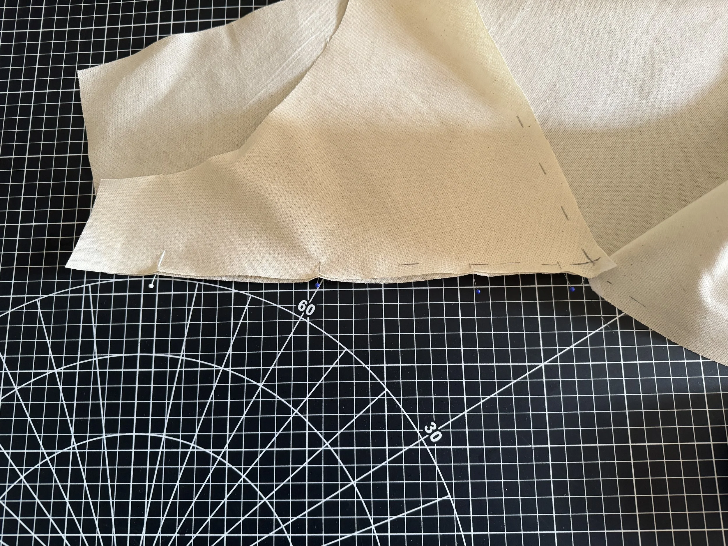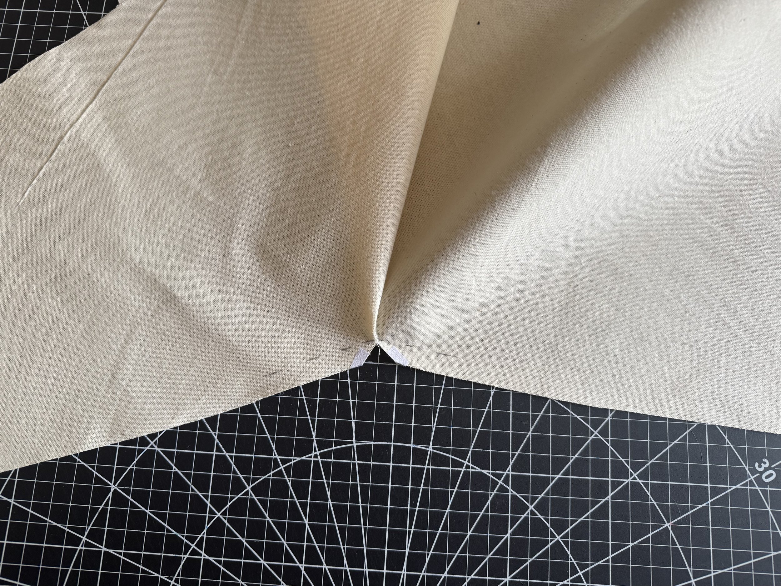 I’m demonstrating on a starched medium weight muslin. I would suggest a light to medium weight fabric for a beginner, as the area where the sleeves intercept with the side seams can be thick and become a little more difficult to sew.