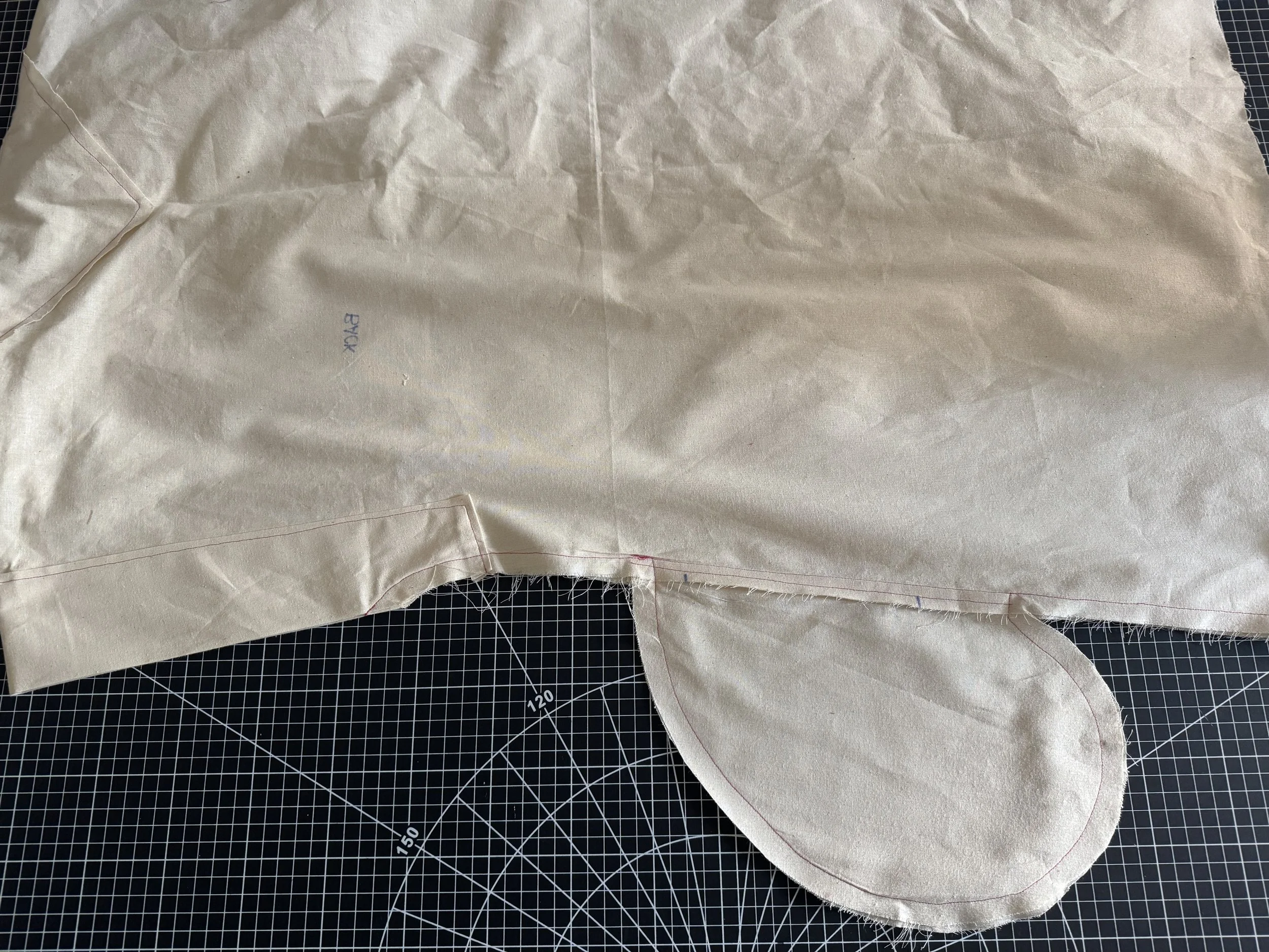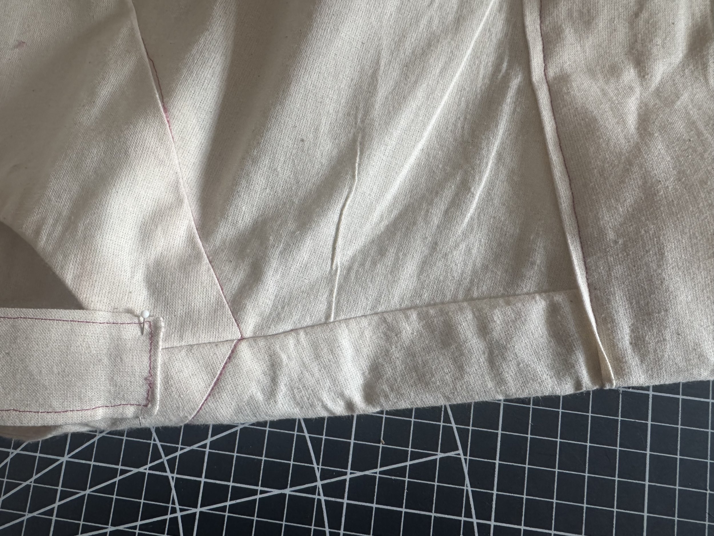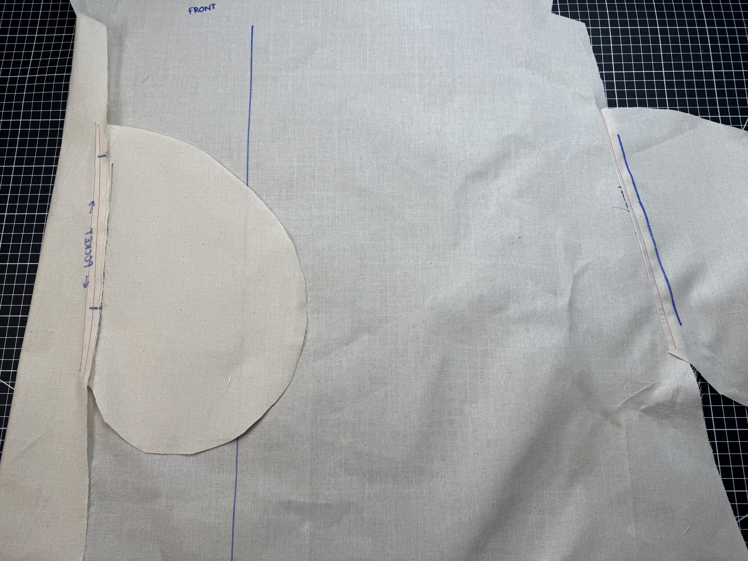 I’m demonstrating on a starched medium weight muslin. I would suggest a light to medium weight fabric if you are a beginner, as the area where the sleeves intercept with the side seams can be thick and become a little more difficult to sew.