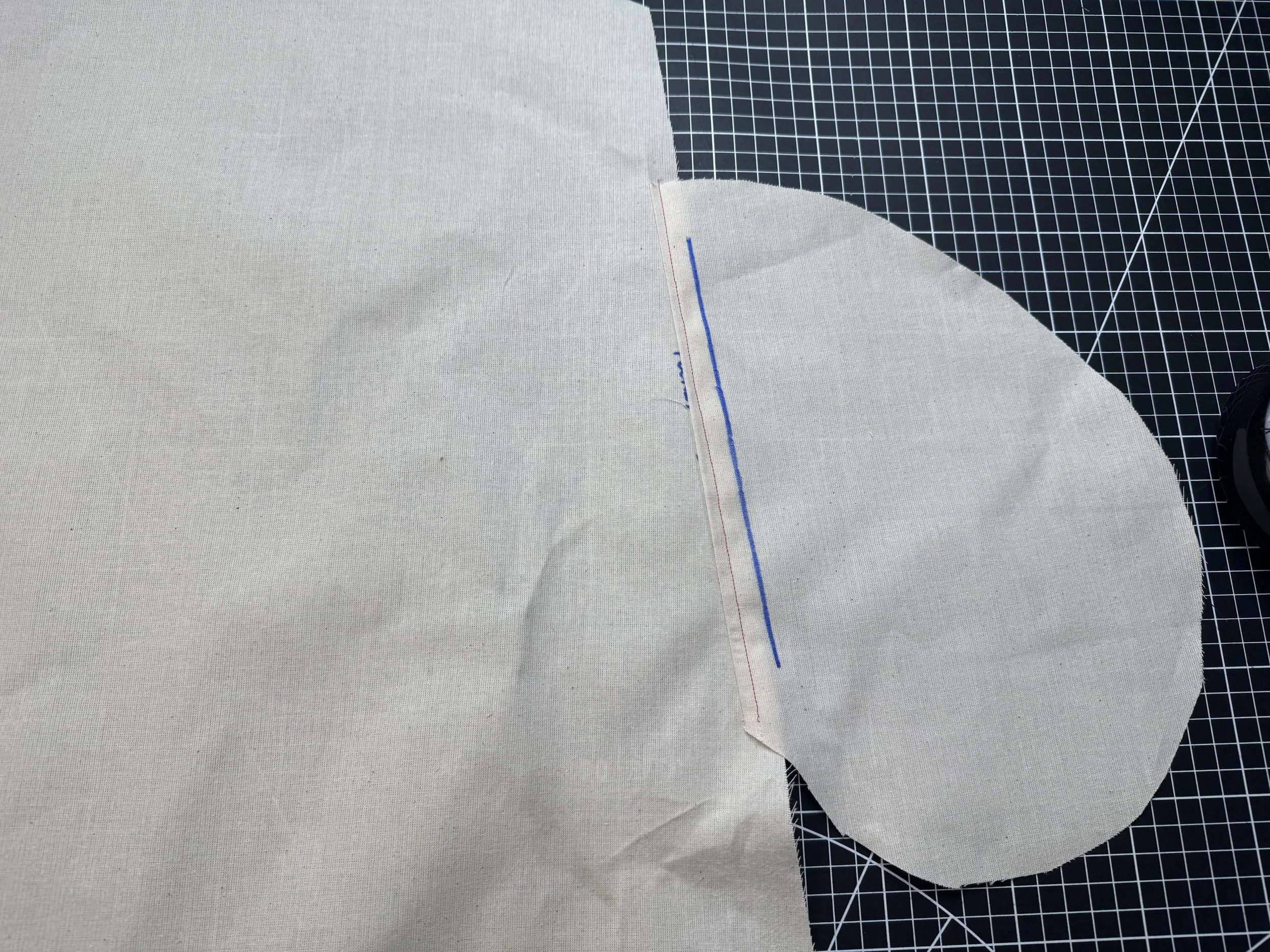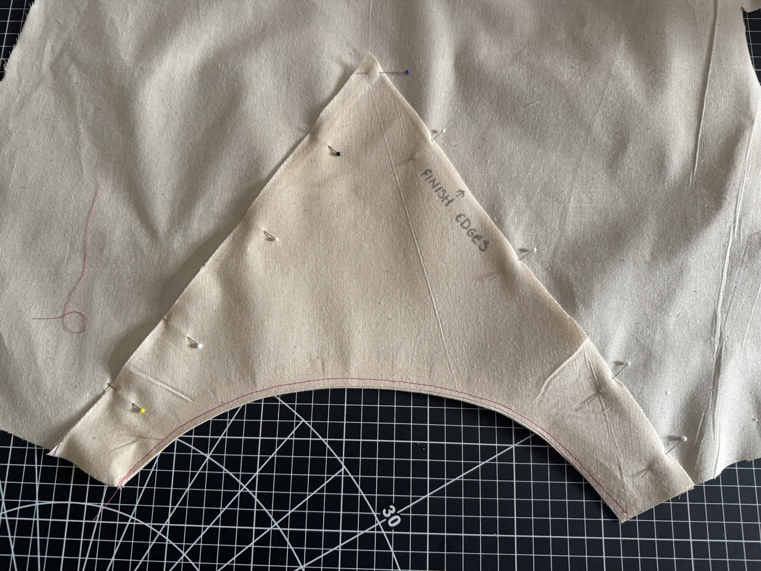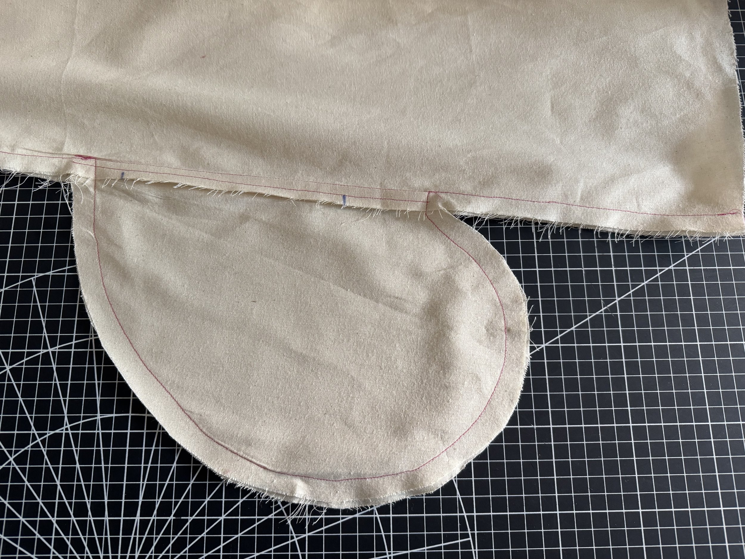I’m demonstrating on a starched medium weight muslin. I would suggest a light to medium weight fabric if you are a beginner, as the area where the sleeves intercept with the side seams can be thick and become a little more difficult to sew.