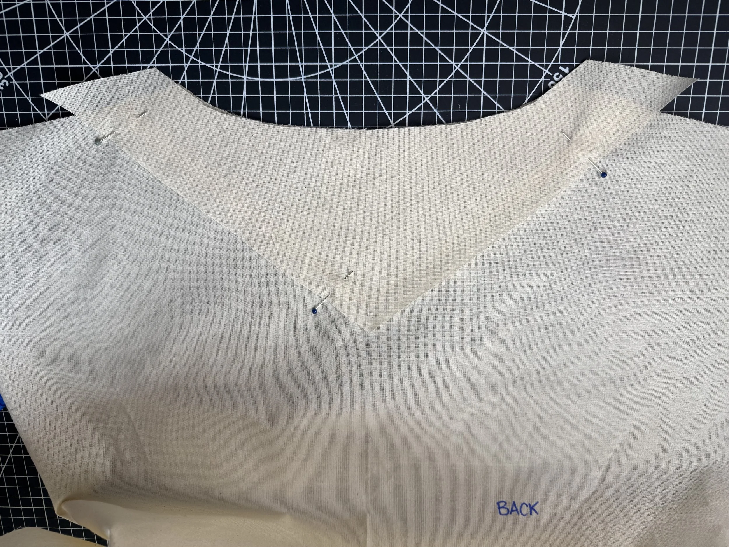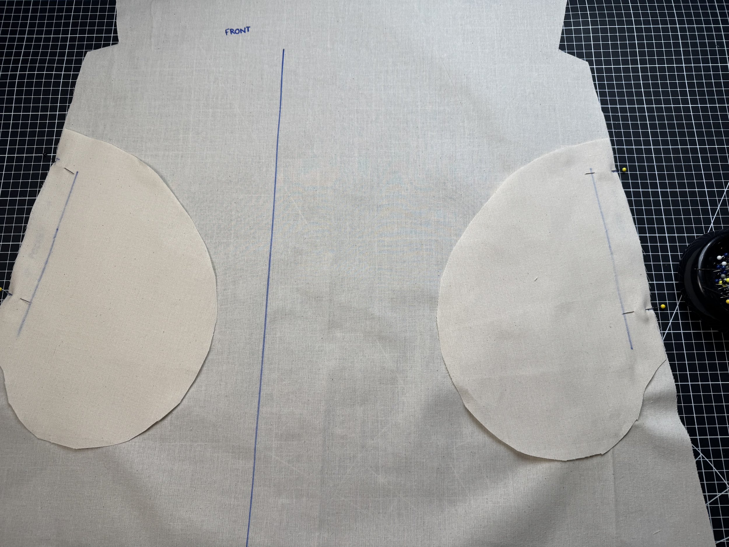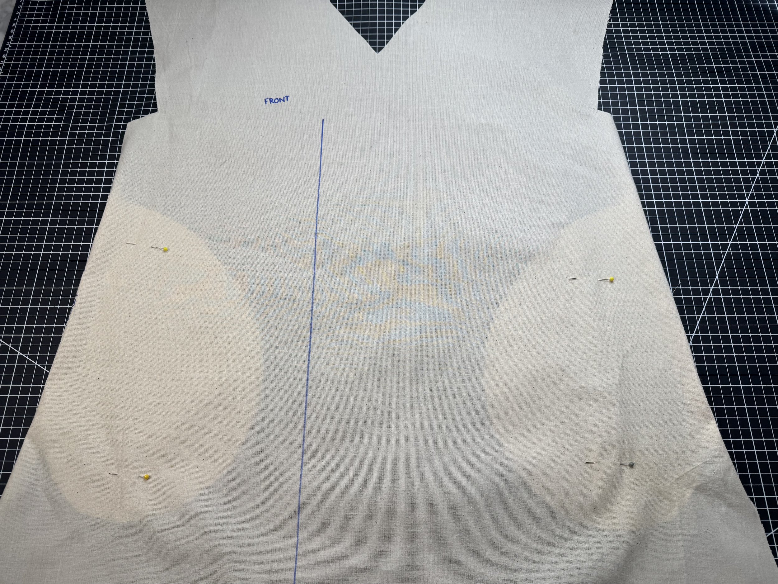 Move your front yoke from the middle to the left of your bodice, pinning along the seam before removing the center point pin.