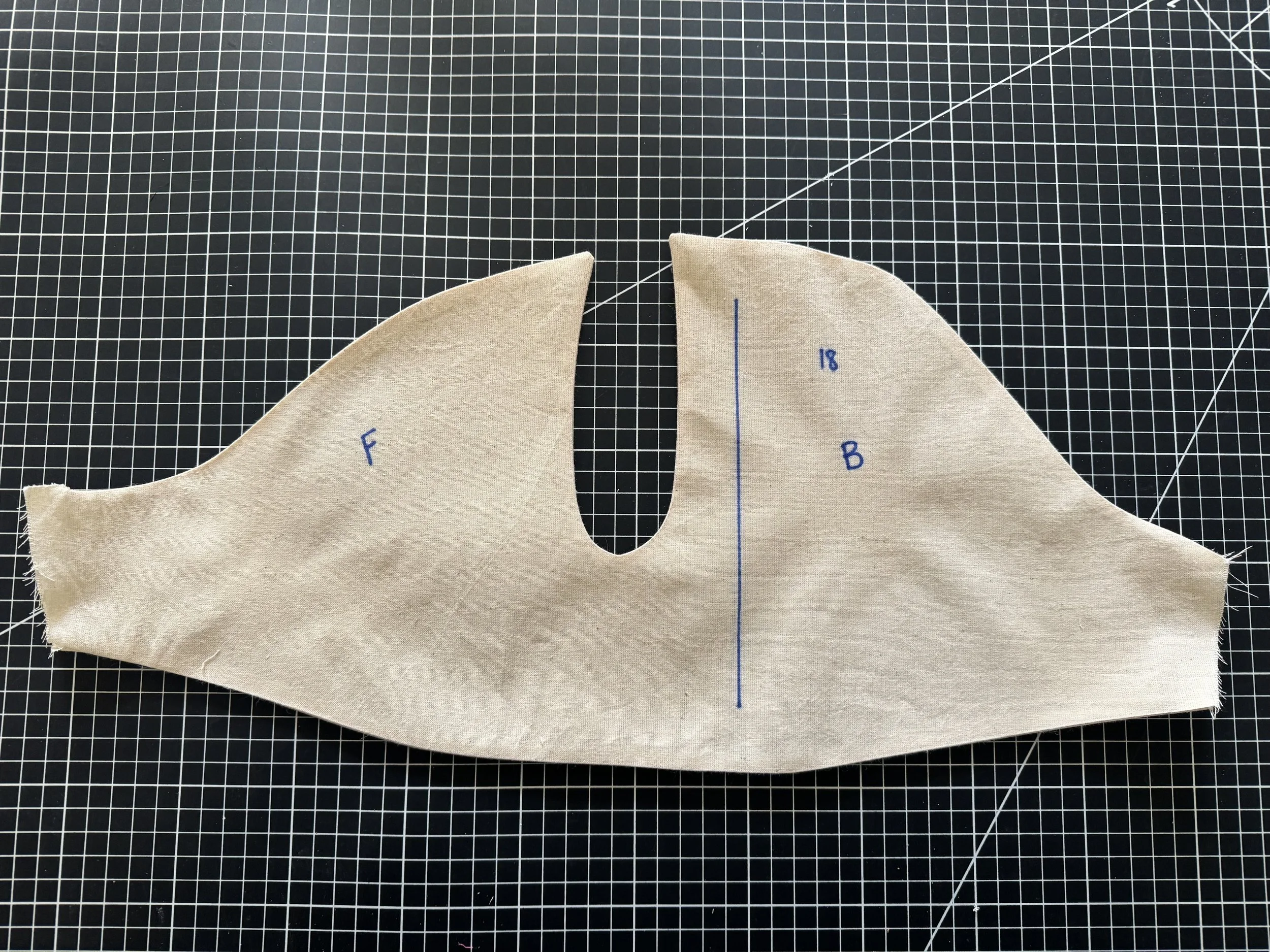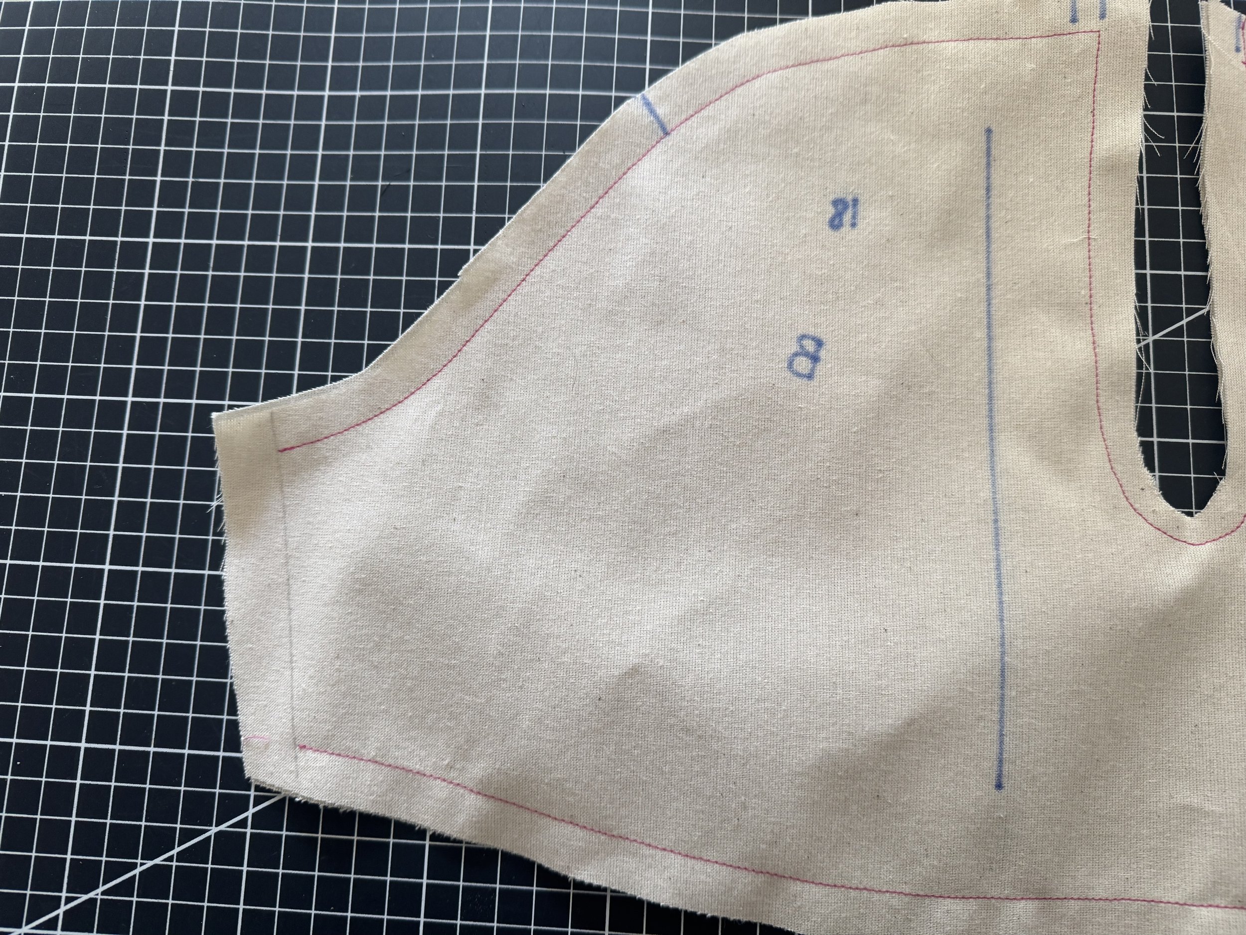 This is self faced, I would suggest if using a thicker fabric, that a lighter complementary one be used for the back of each side to reduce bulk around the armseye.