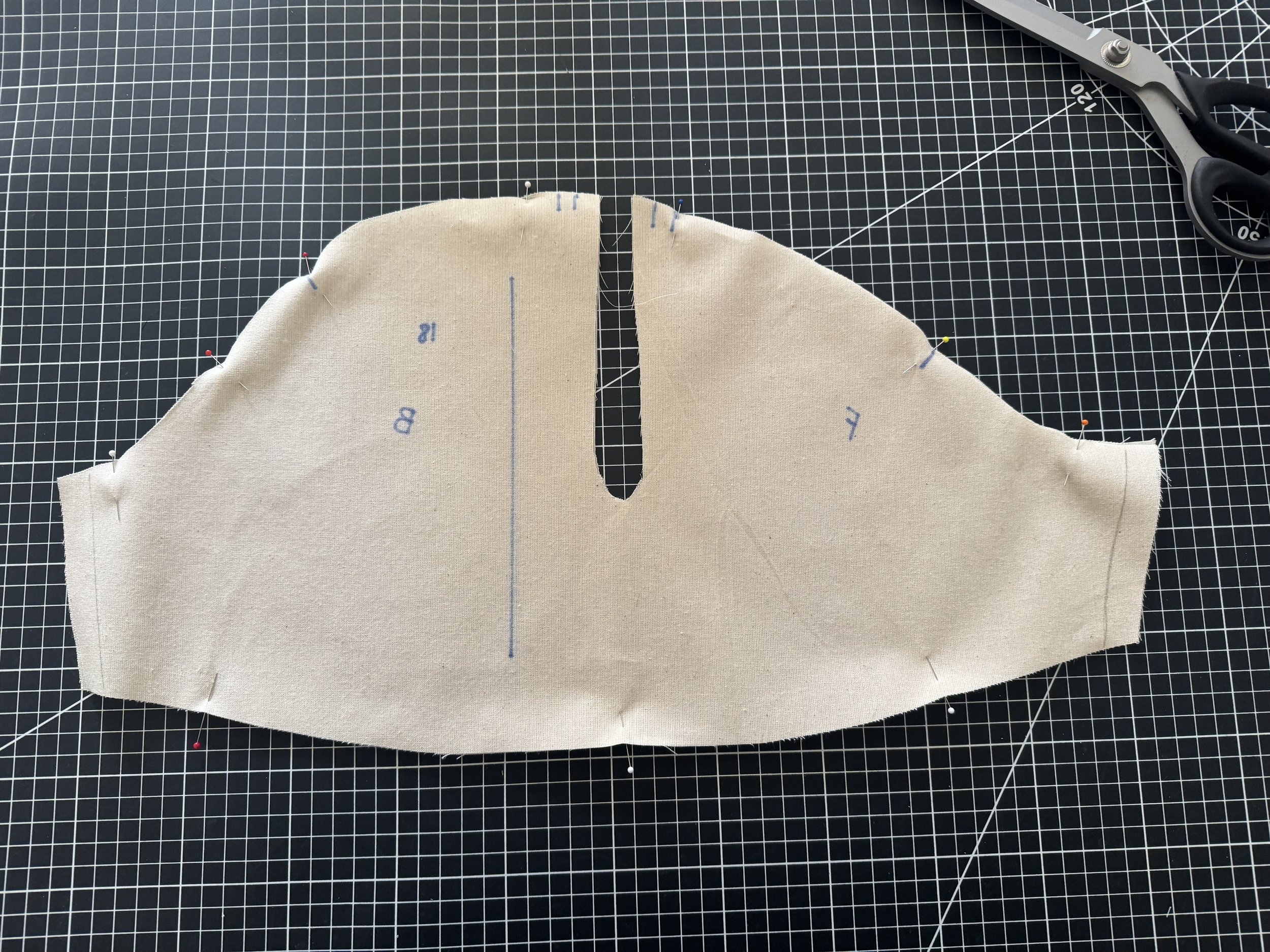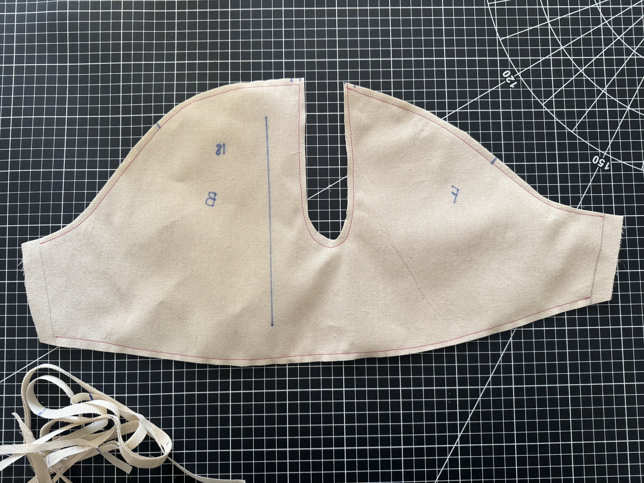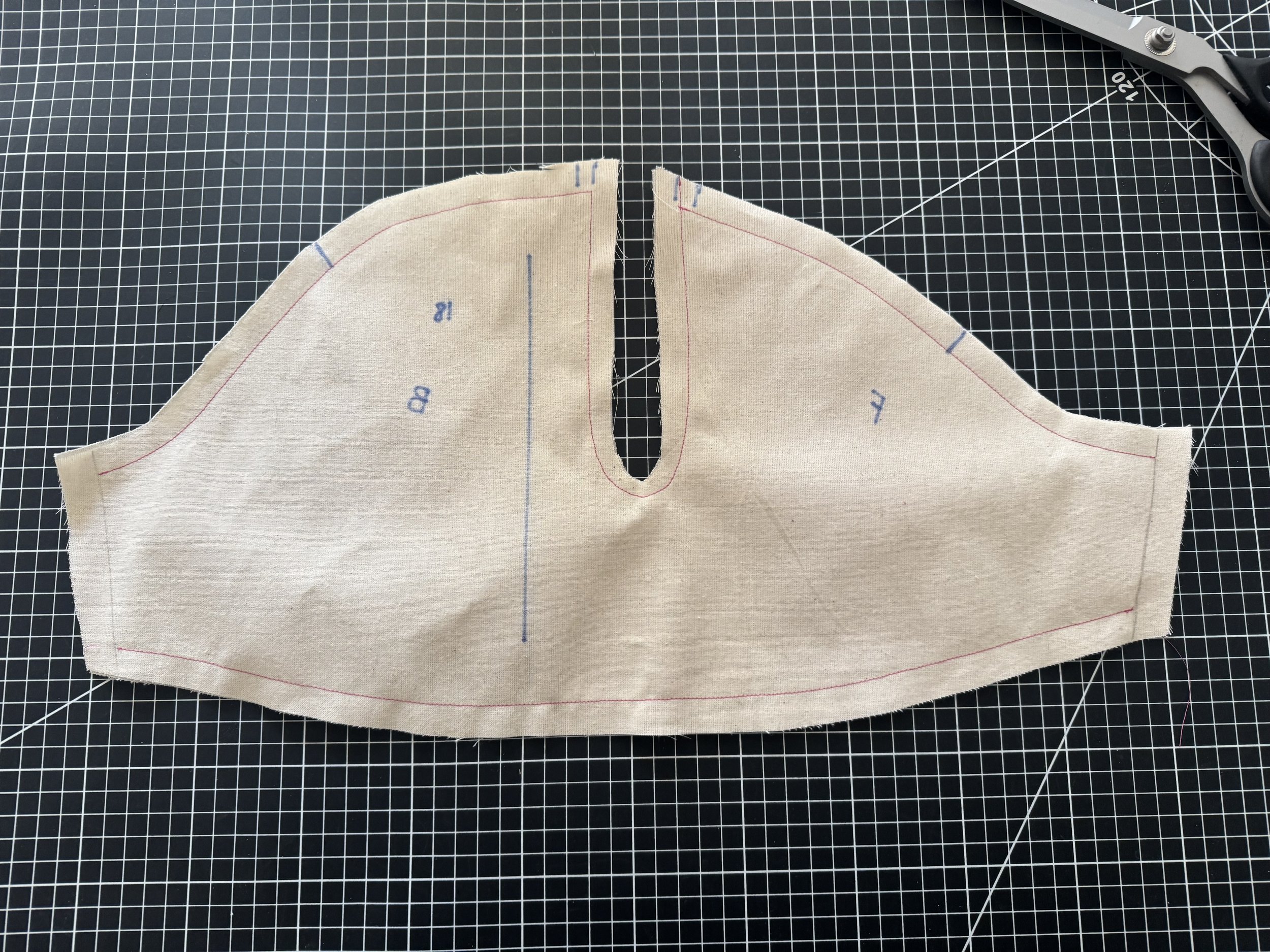 To finish the sleeve, cross your upper sections over, and sew two rows of basting stitches from notch to notch.