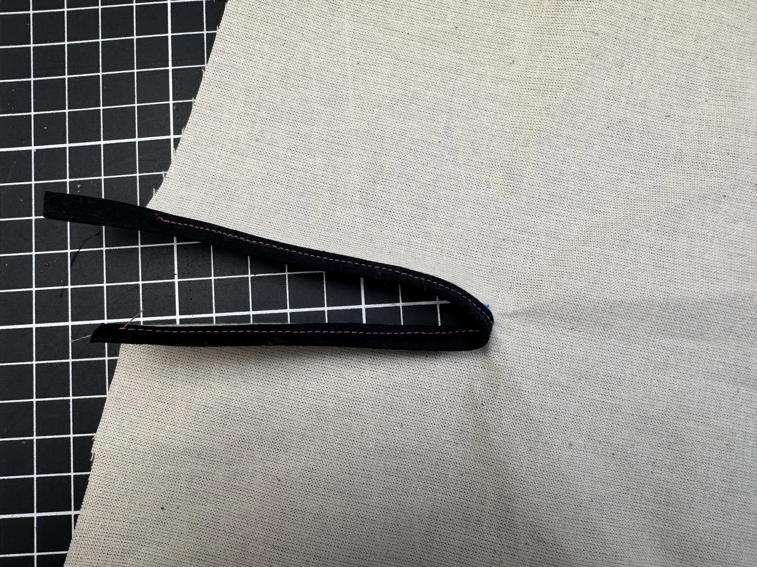 Run a 2.4 stitch along the length of the bias strip catching both the front and back. When sewing, open up the entire slit so it becomes a straight line as it passes through the machine - this makes sewing the curved area easier.