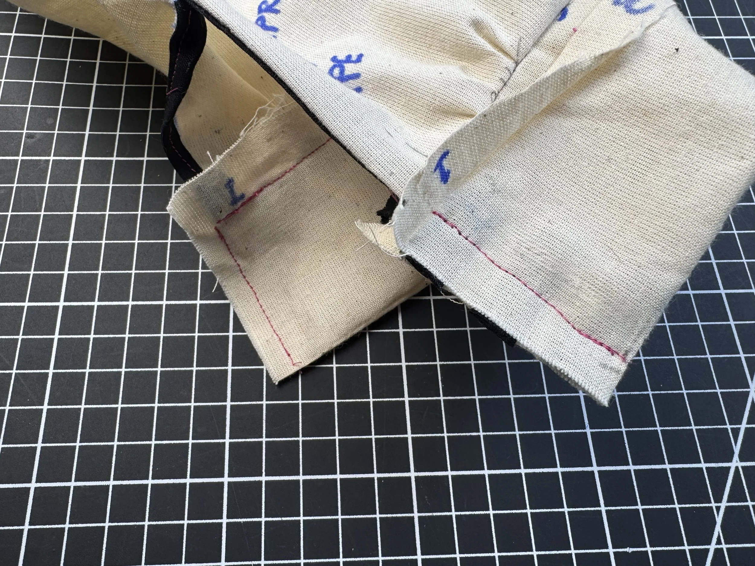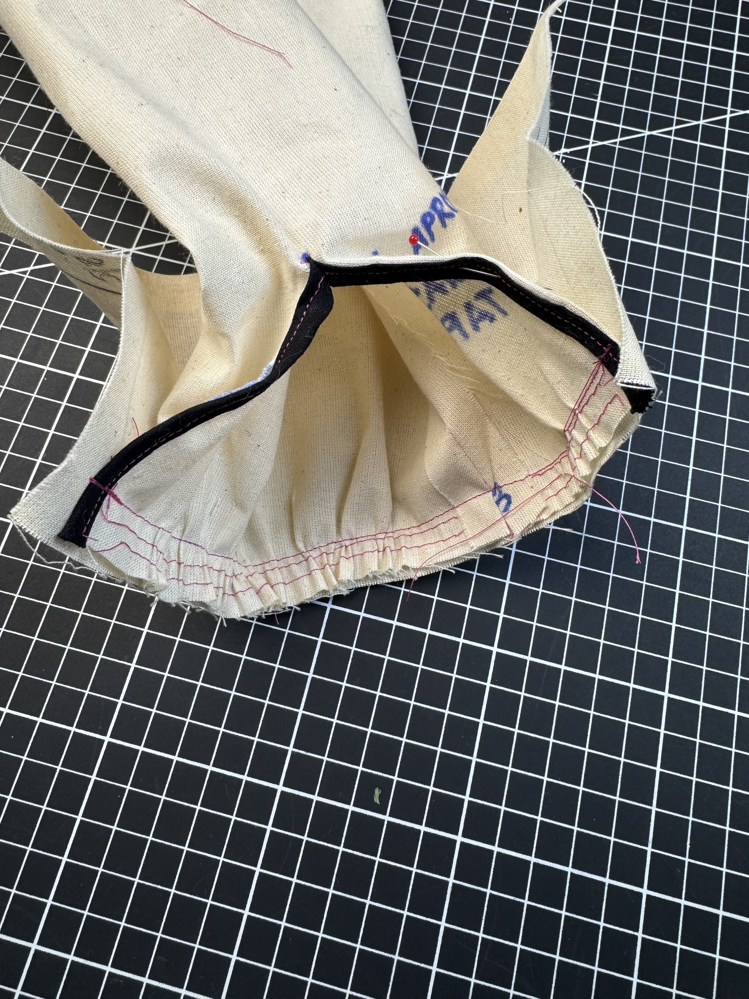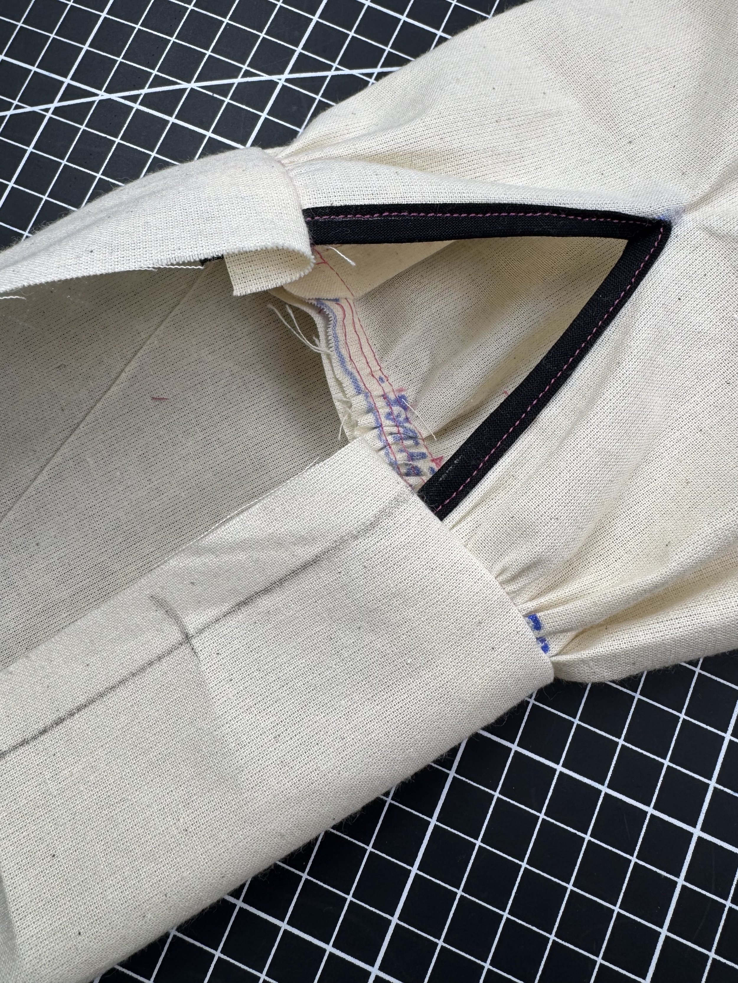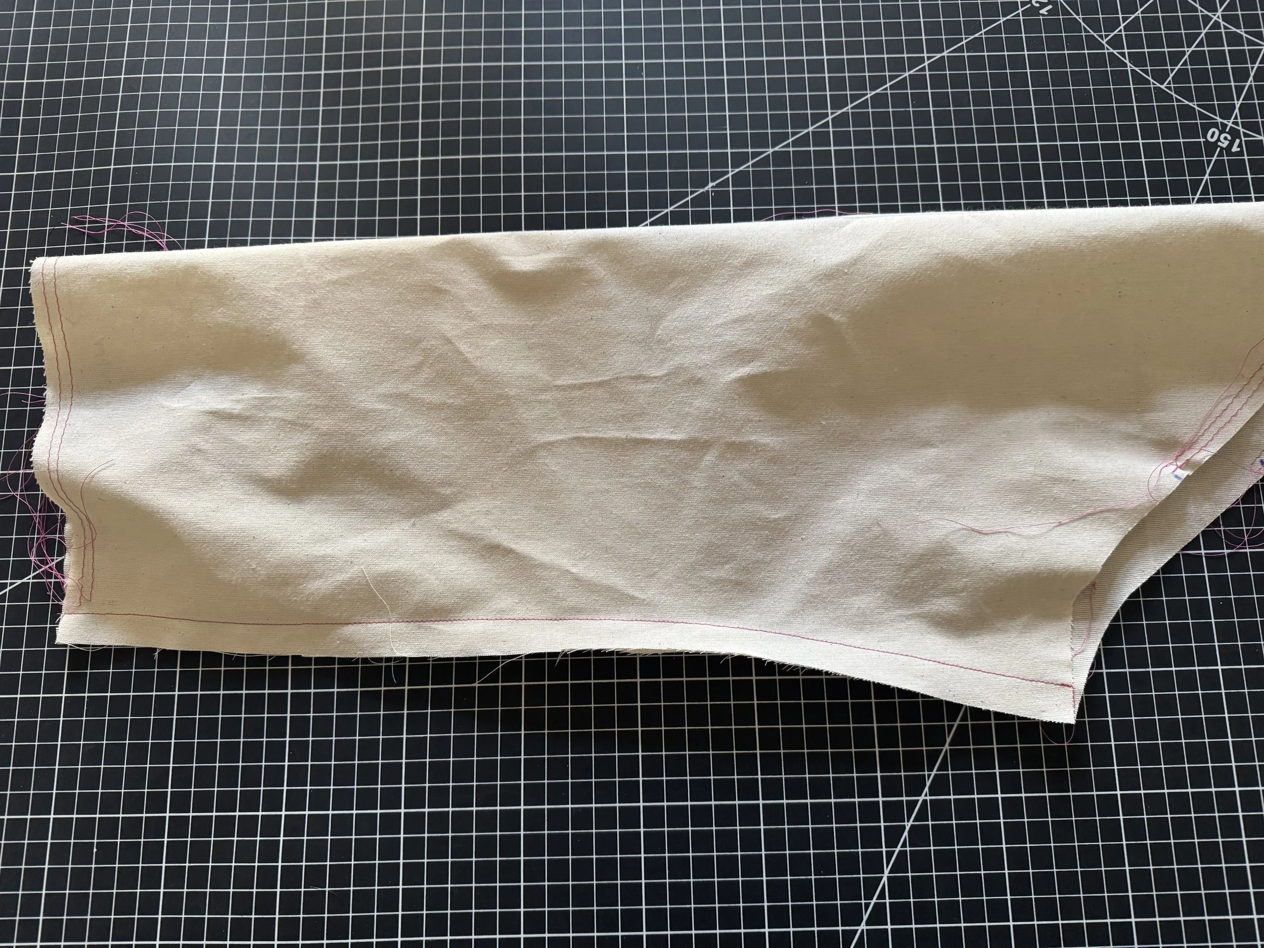 Fold the edges of the cuffs - right side to right side. Sew the edges, this might not be exactly 5/8โ. Your seam should follow the line of the bias tape for a clean straight finish. Trim the edges to reduce bulk.