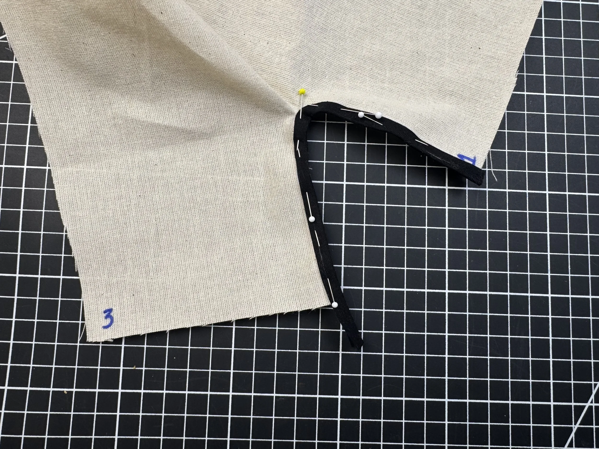 Pin to hold in place - there will be a tiny crease above the curve, that is inevitable due to the manipulation of the fabric and wonโt be noticeable once we add the gathers at the cuff.