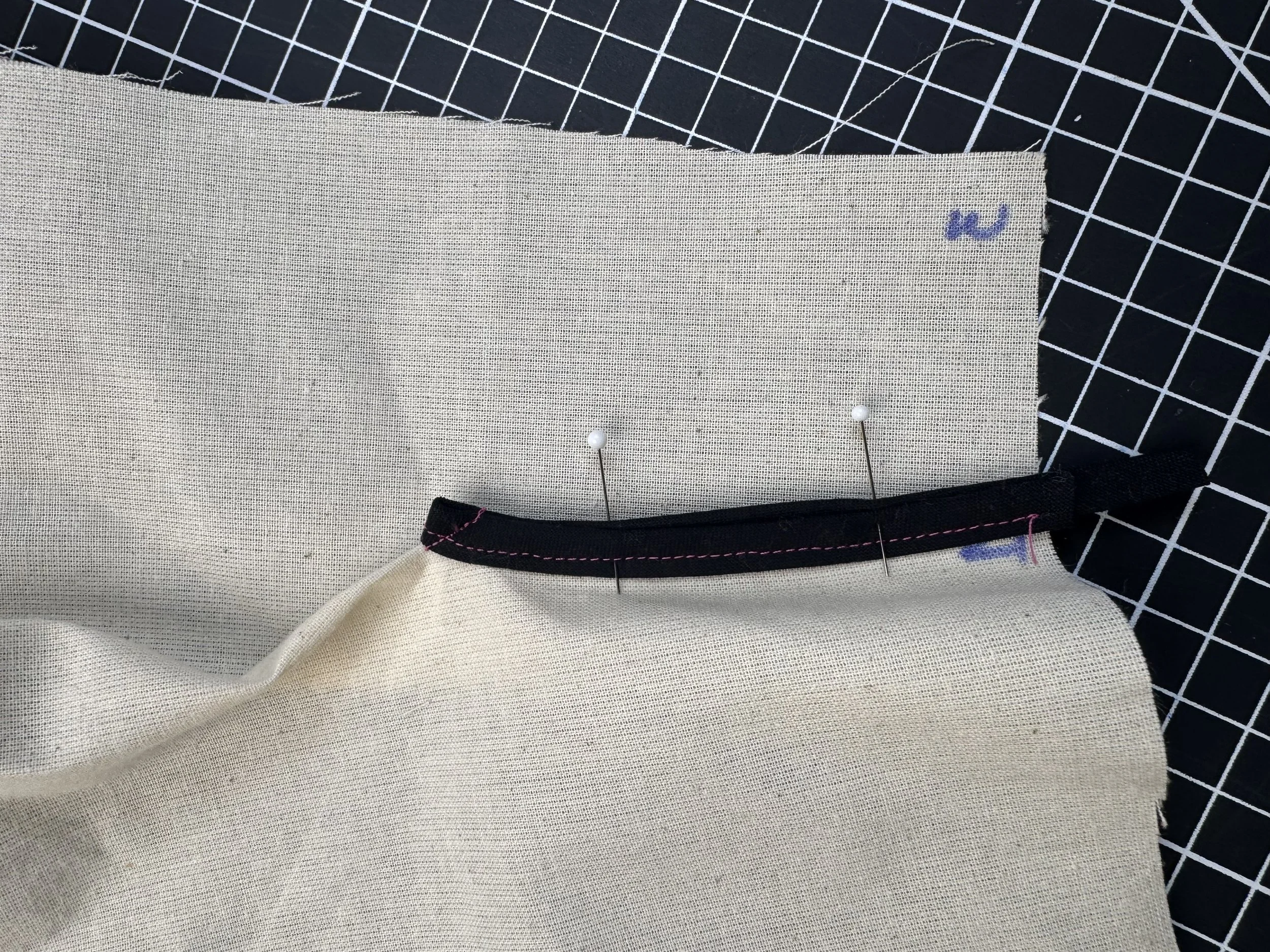 Slide the folded bias tape onto the seam, pinning well to hold it firmly in place. Adding a quick hand stitch to replace the pins before sewing can be helpful in such a small area.