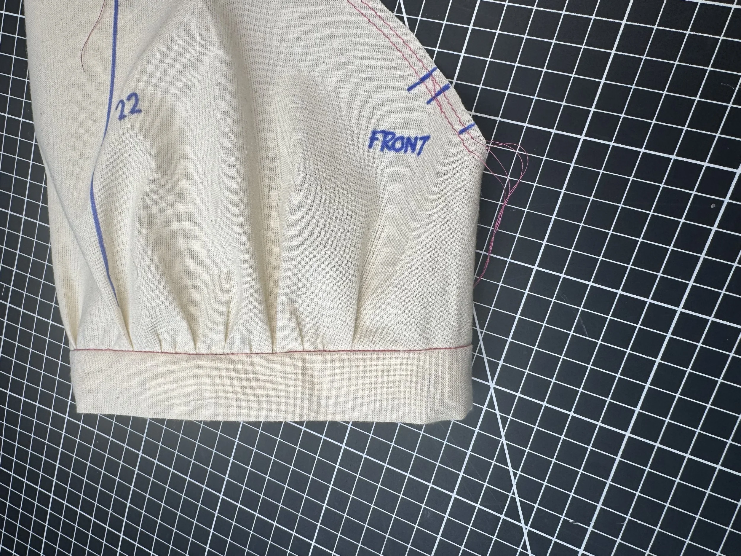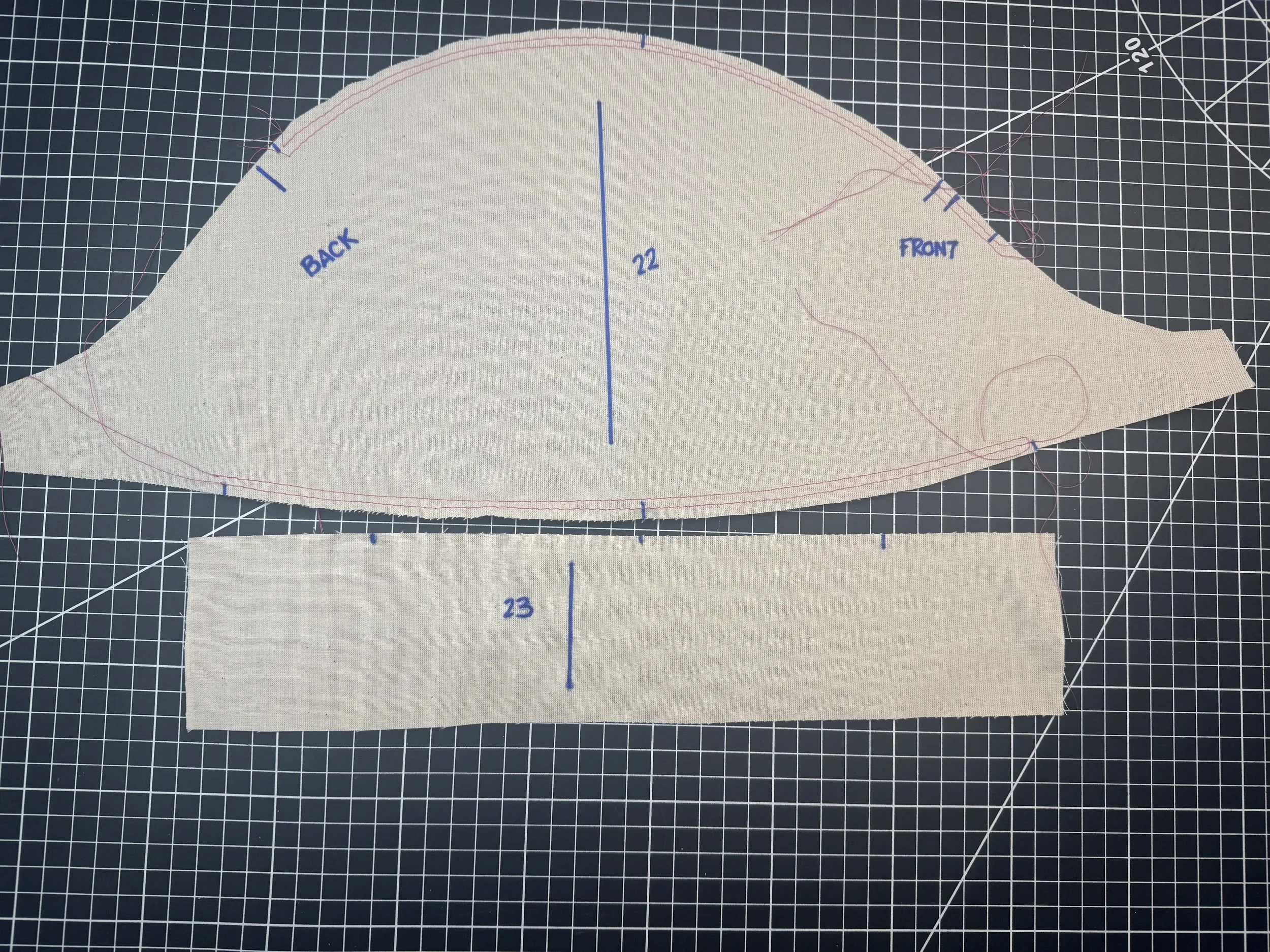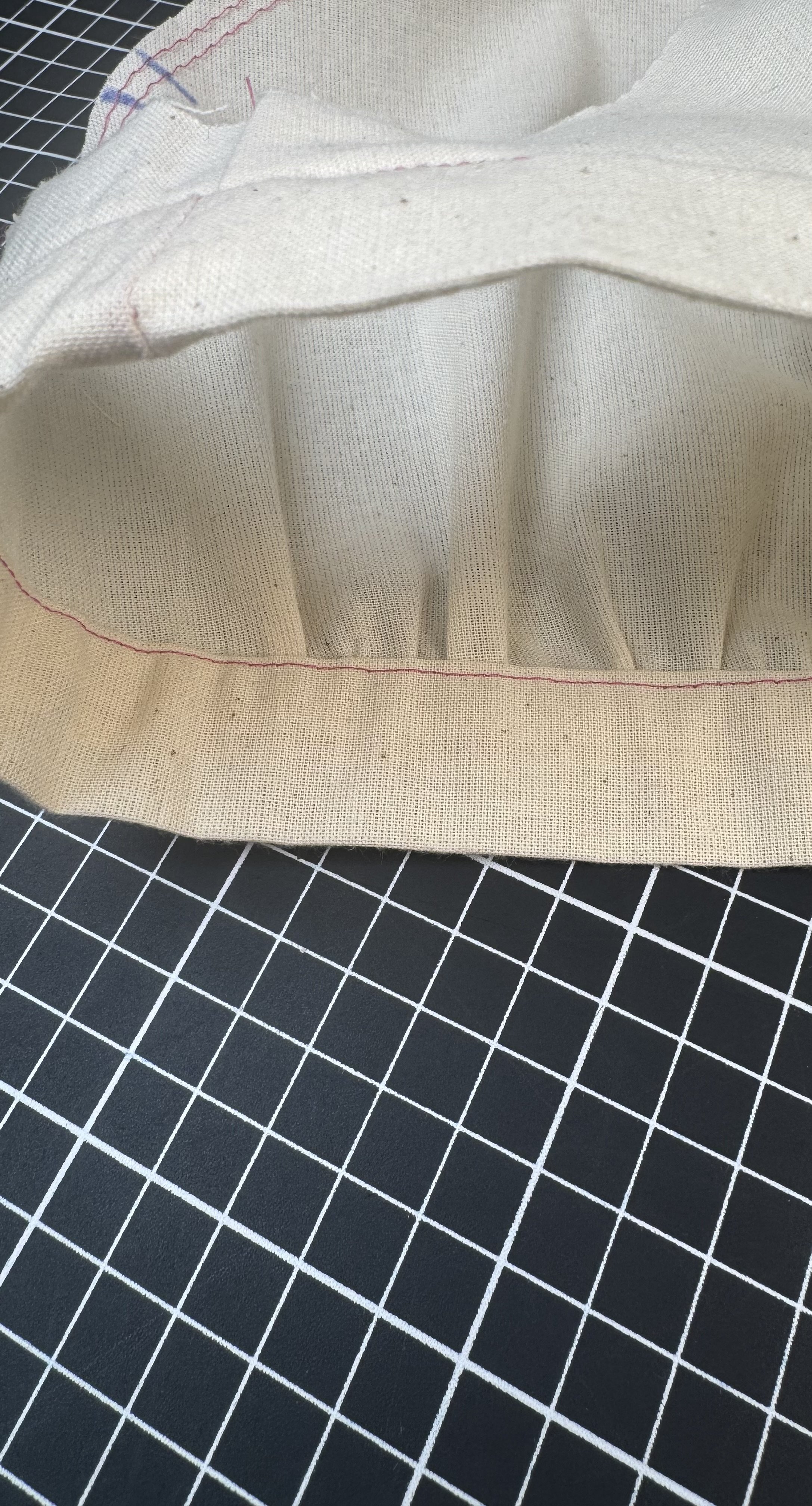 To begin, finish your edges by serging, before running two rows of gathering stitches between the notches on both the upper and lower portion of each pieces.
