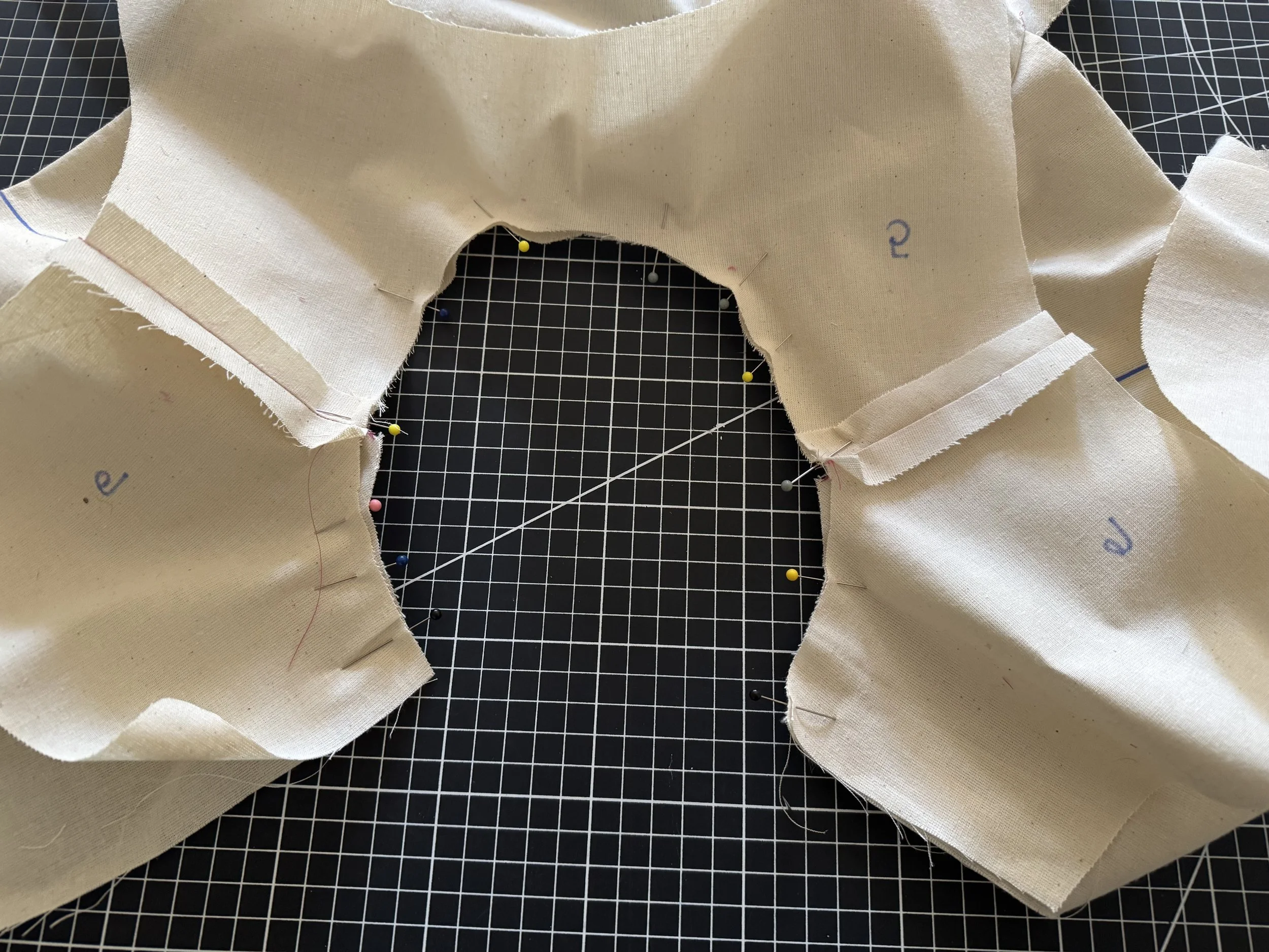 Pin the neckline of the facing to the neckline of the bodice, matching shoulder seams.