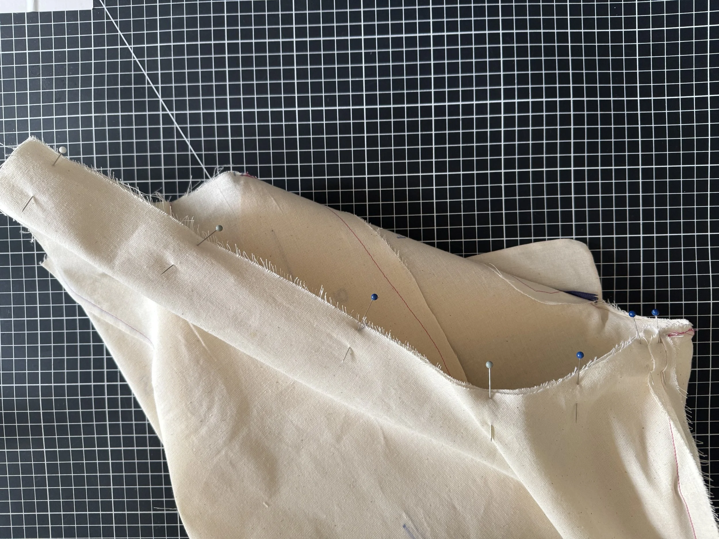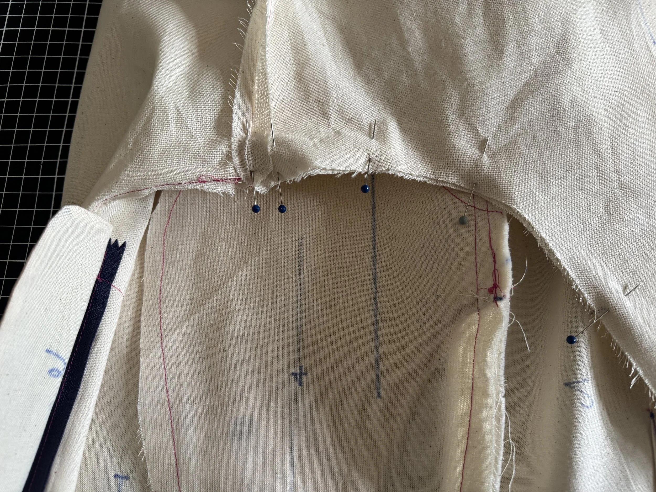 Pin the curved crotch area from the back waist to the zipper stitch line.