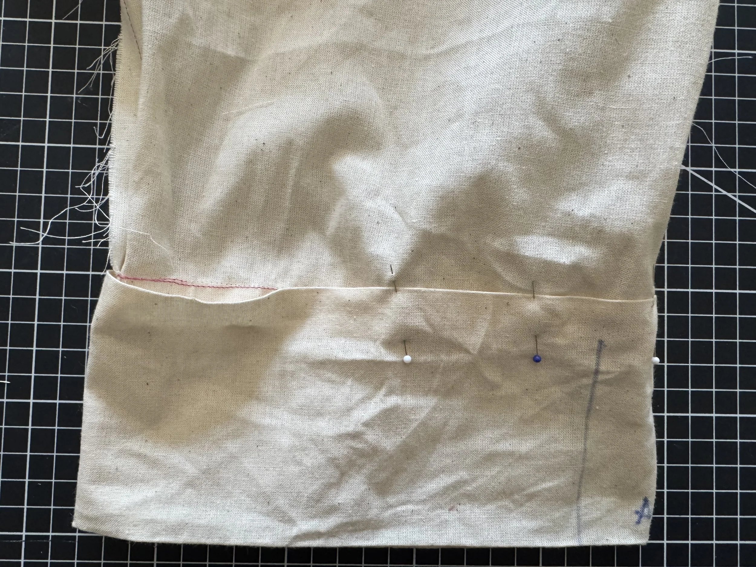 Fold the cuff to the inside of the pant, and pin well. The pre-folded seam should cover the stitches as shown.
