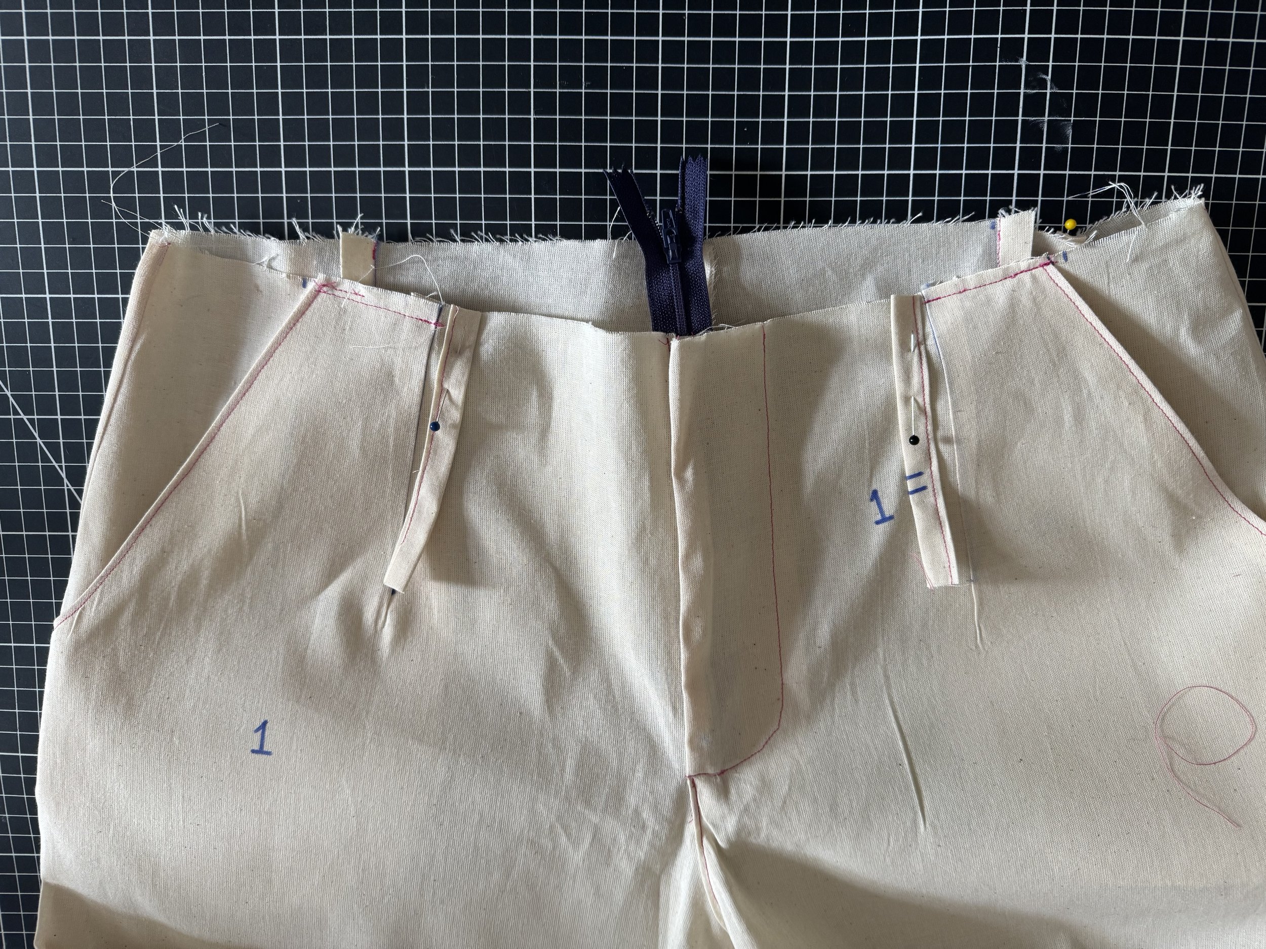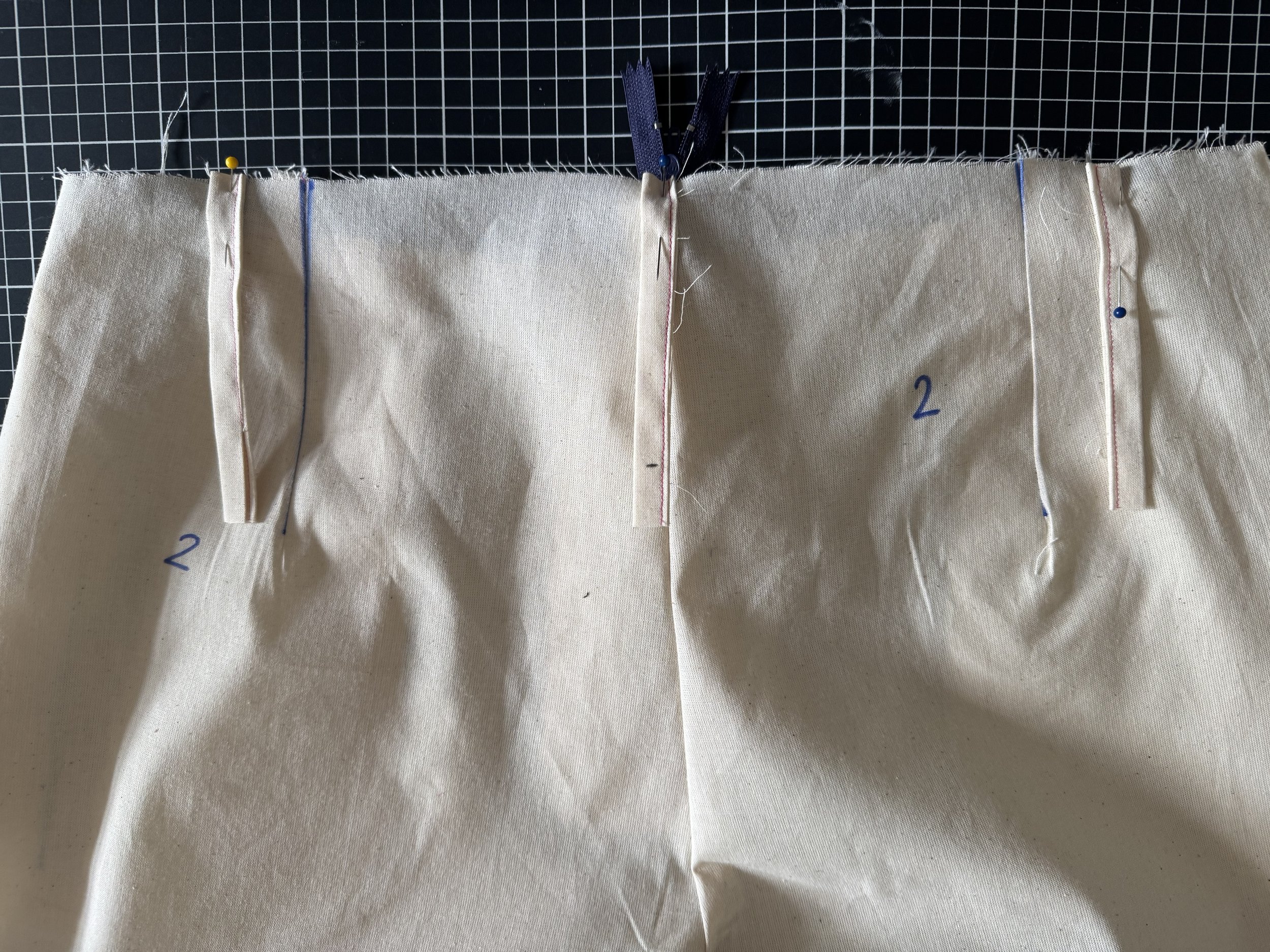 Pin two of the belt loops to the fronts, just inside of the darts towards the center.